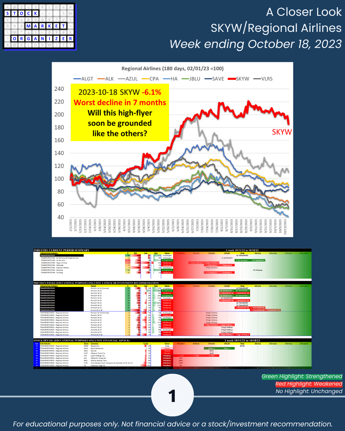 Below is one way to give context to this situation. The Regional Airlines have all been suffering, while SKYW has not. But it had its worst day today 2023-10-18 since March 15, 2023 and energy prices are rising (as noted in this post the Energy industry is rated Strong and as noted in this post Independent Oil & Gas had a strong week).