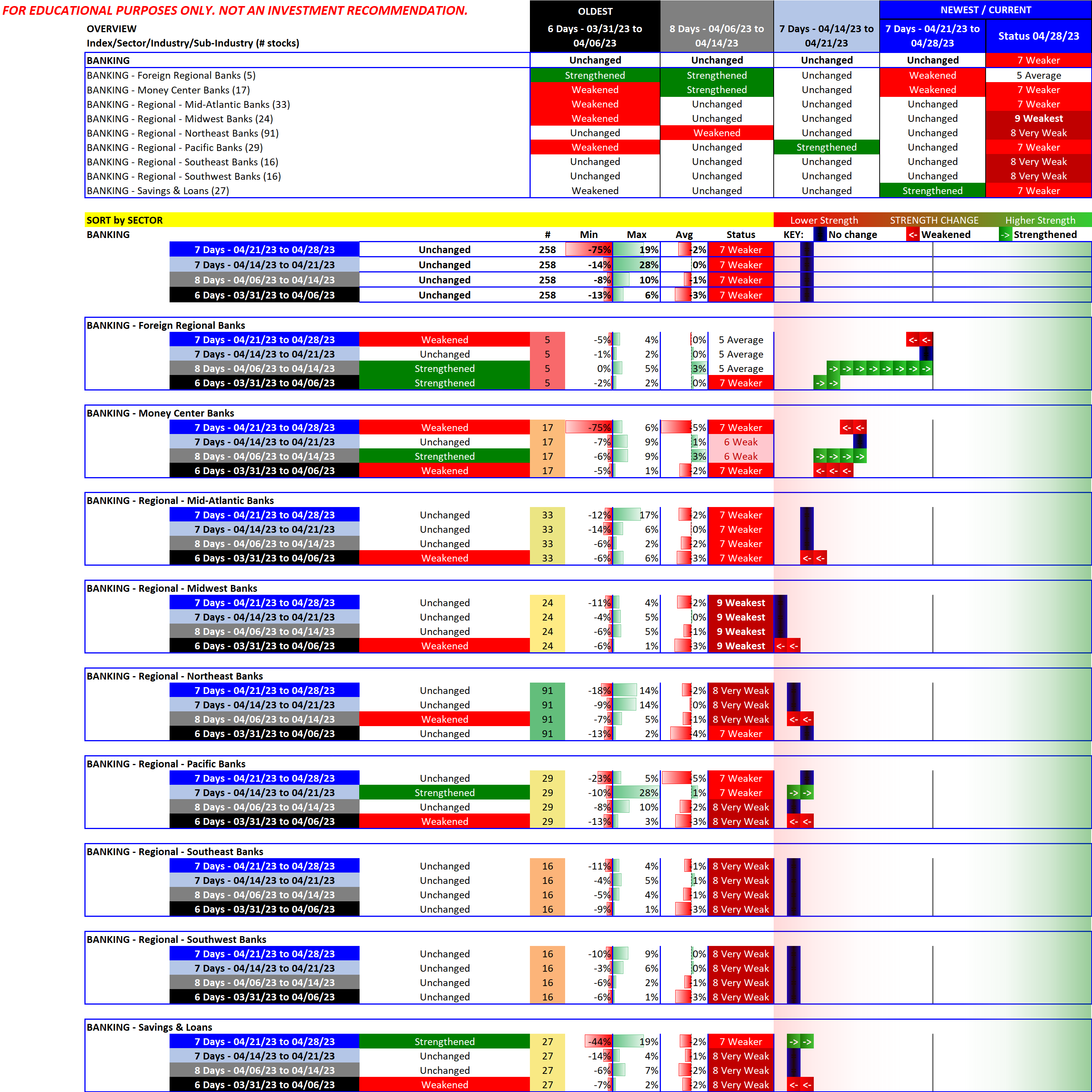 Banking's strength rating is "Weaker" and its strength is unchanged over the past week. Following is a summary by sub-industry of the sequential week-by-week changes over the past month.