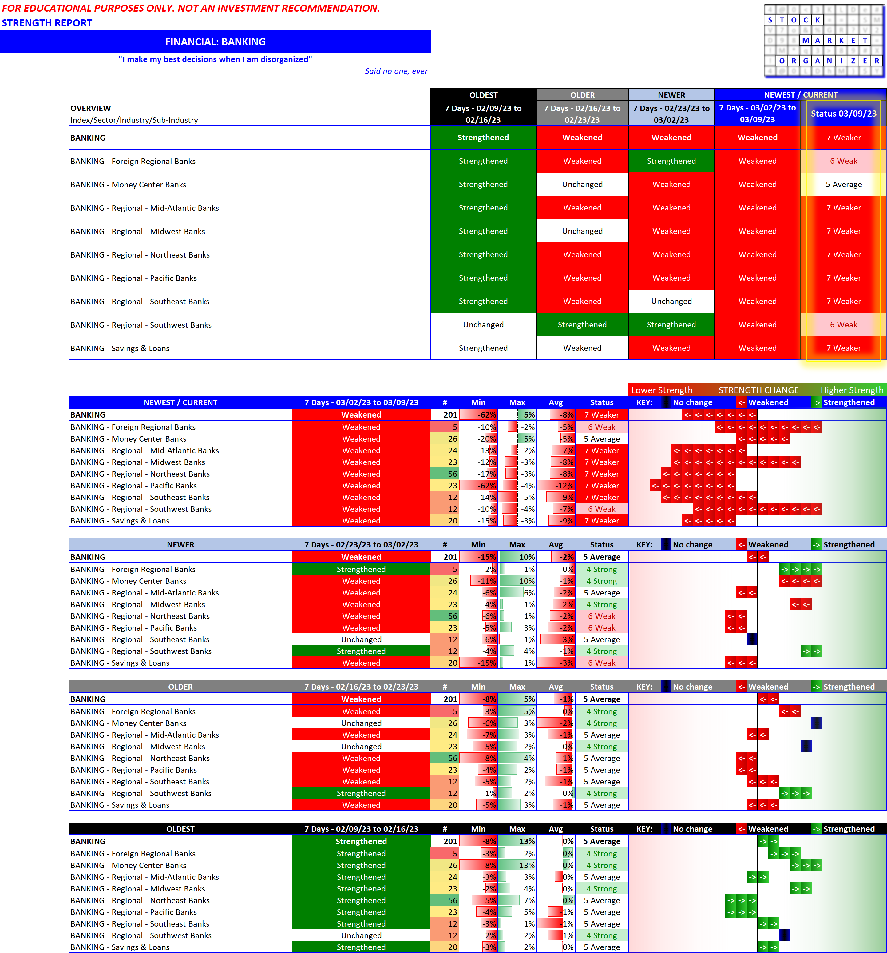 This is not a prediction that the current environment will lead to something like this. It is purely a look at a bottom. For comparison, see below the banking industry strengthening/weakening overview from the downloadable report available here: