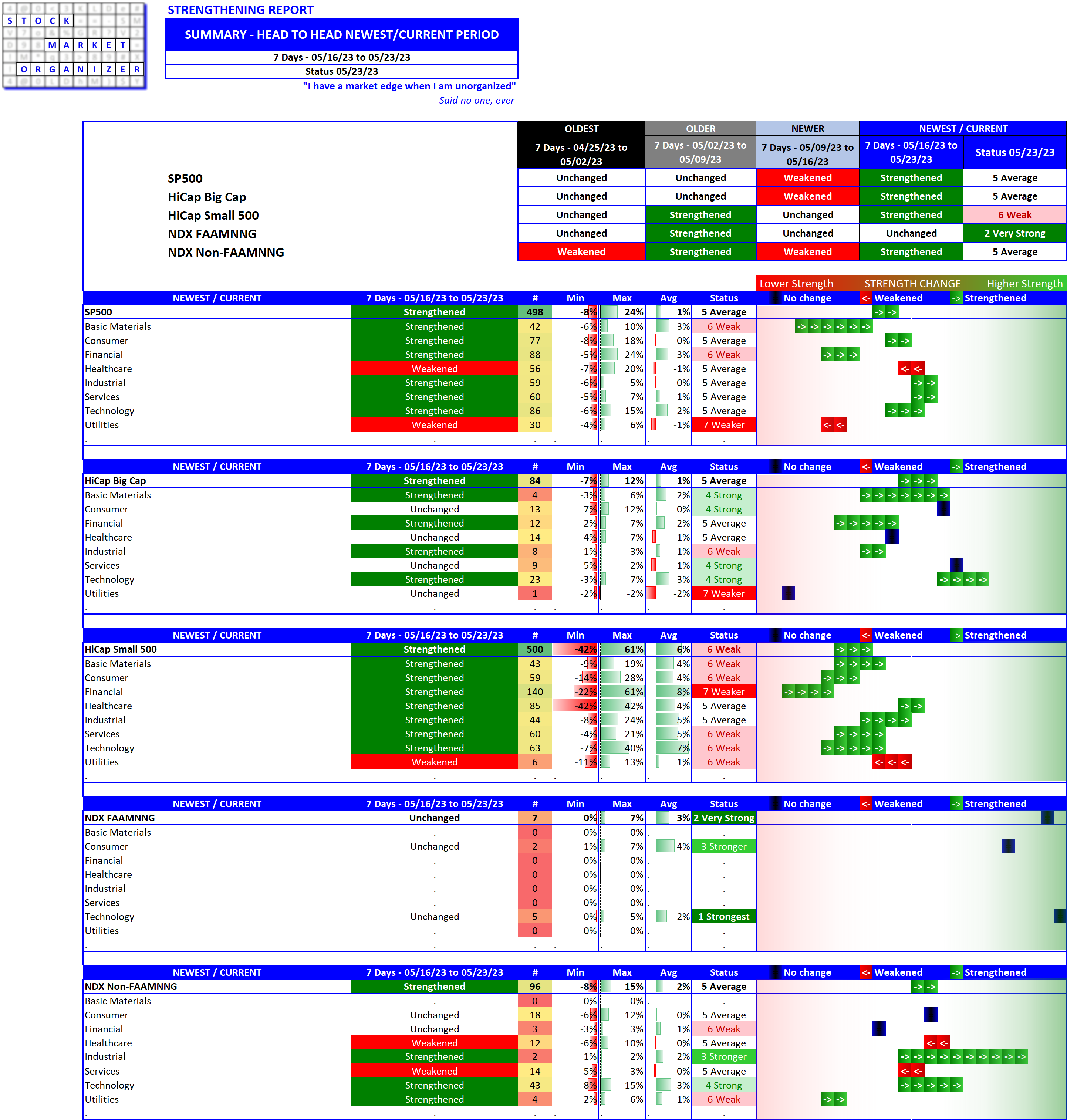 A different look at big vs. small caps that you won't find anywhere else. FAAMNNG Very Strong, other big caps (S&P500) are Average as small caps lag BUT may be starting to flex based on this past week. Will this continue? Other notes - GE doing well and not getting any press. Semis making a statement, based on 9 "Strongest" in the NDX. Excruciating detail in the document linked below, yellow highlights offer summary relief. Immediately below: a summary.