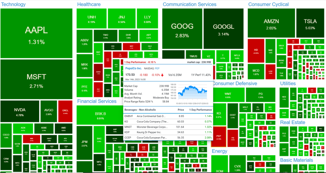 Some use "heat maps" that show comparative performance for stocks, segregated into sectors. One example is above, another is below which shows the detail screen that pops up for any individual stock (PepsiCo in this case):