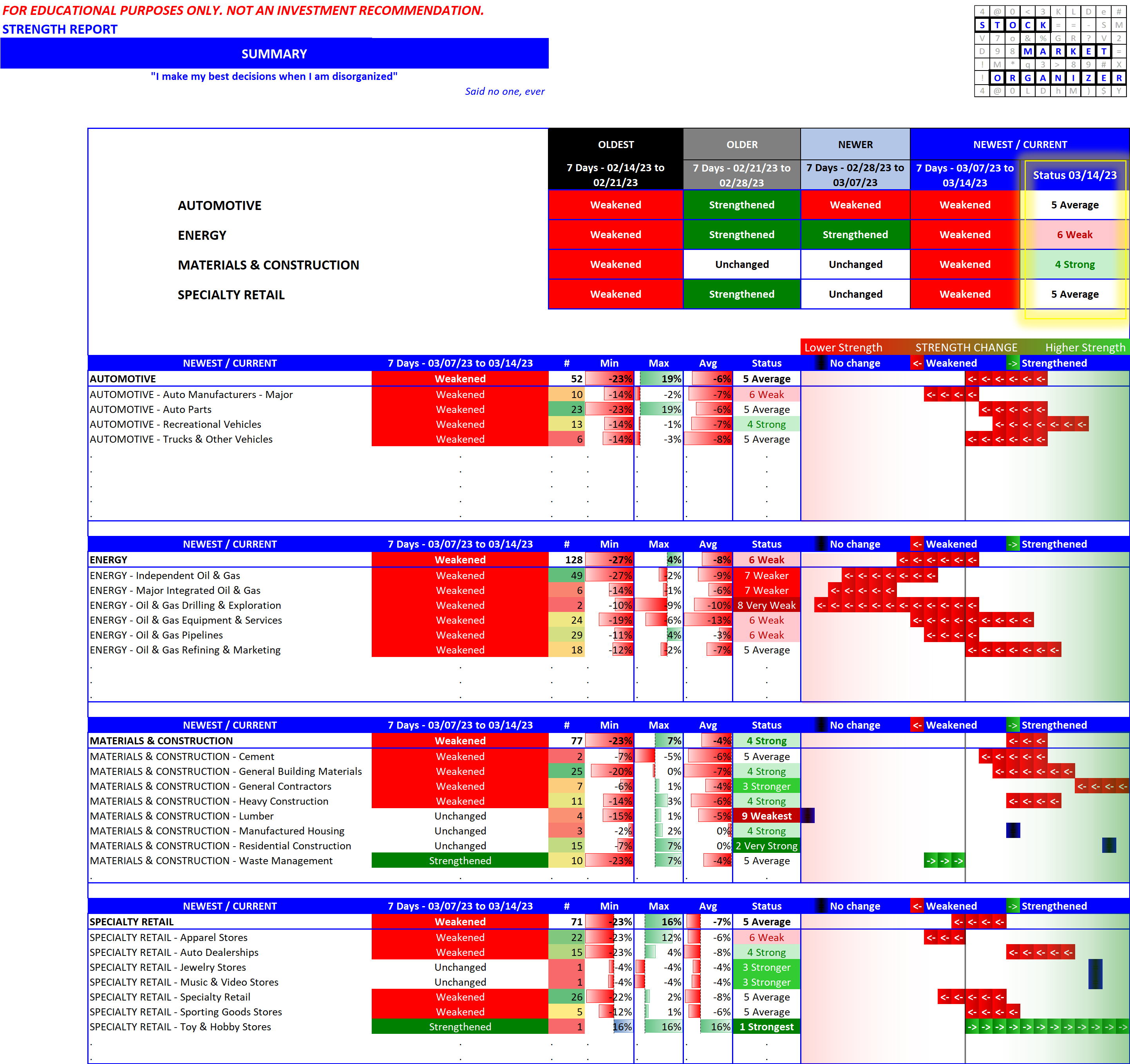 Heat maps may work for some as guideposts for areas of interest. Below is another possibility if you have any interest in looking at strengthening/weakening. This will be expanded upon in future posts (and is the same basic information as has been presented in previous posts) - in the meantime take a look at how this directly compares strengthening and weakening between four disparate industries.
