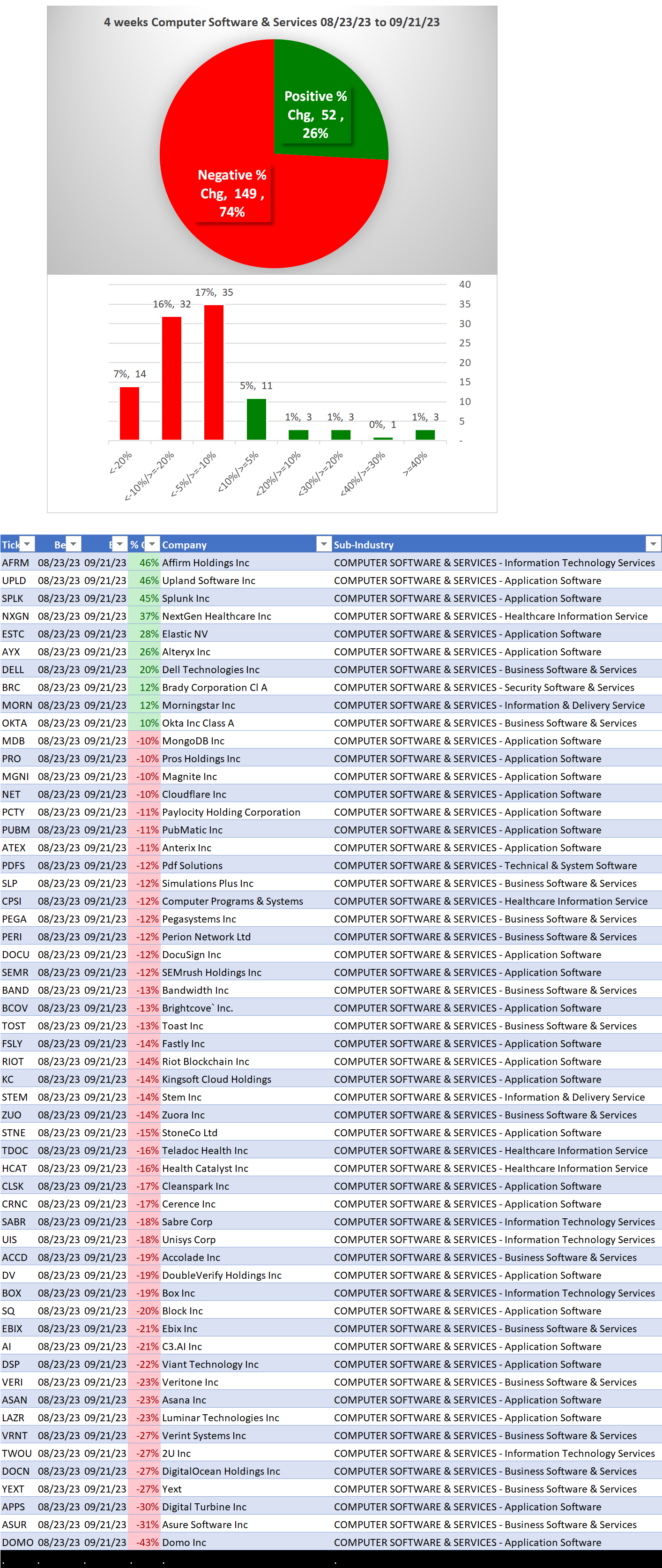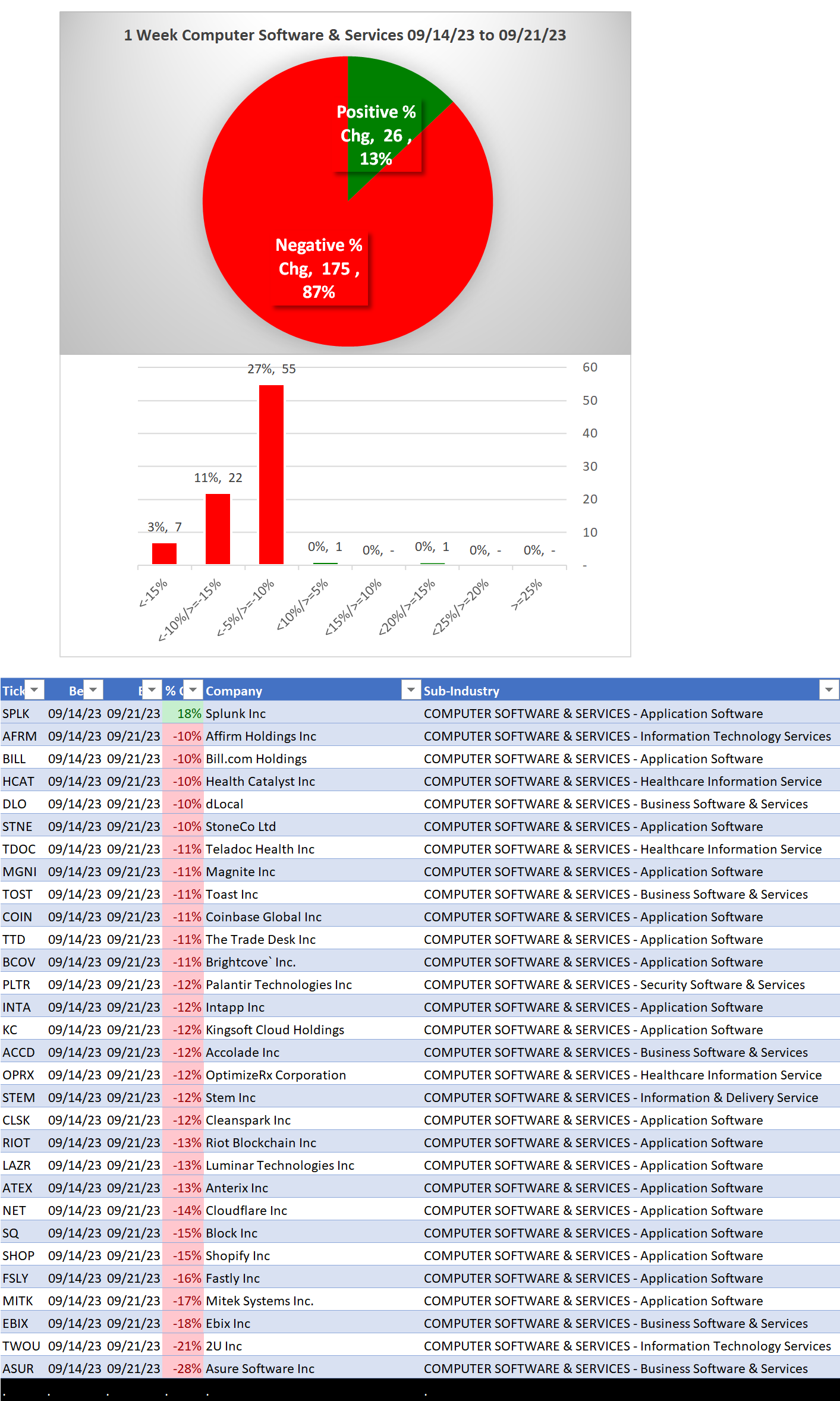 - SPLK/Splunk is a top performer 1 week and 4 weeks. Today its acquisition by CSCO/Cisco was announced. Otherwise, no stocks for the past 1 week were up more than +10% and 29 were down more than -10%.