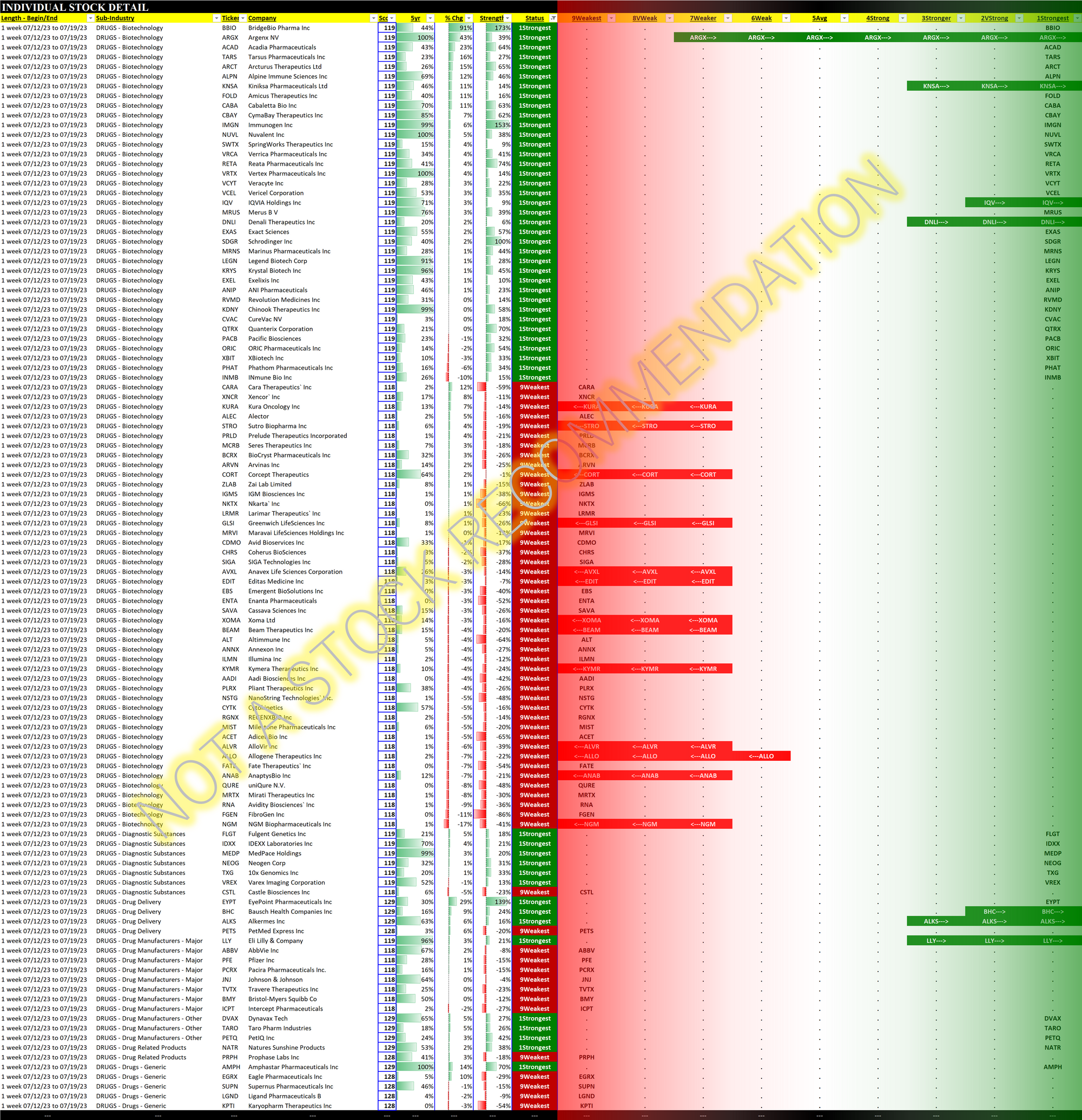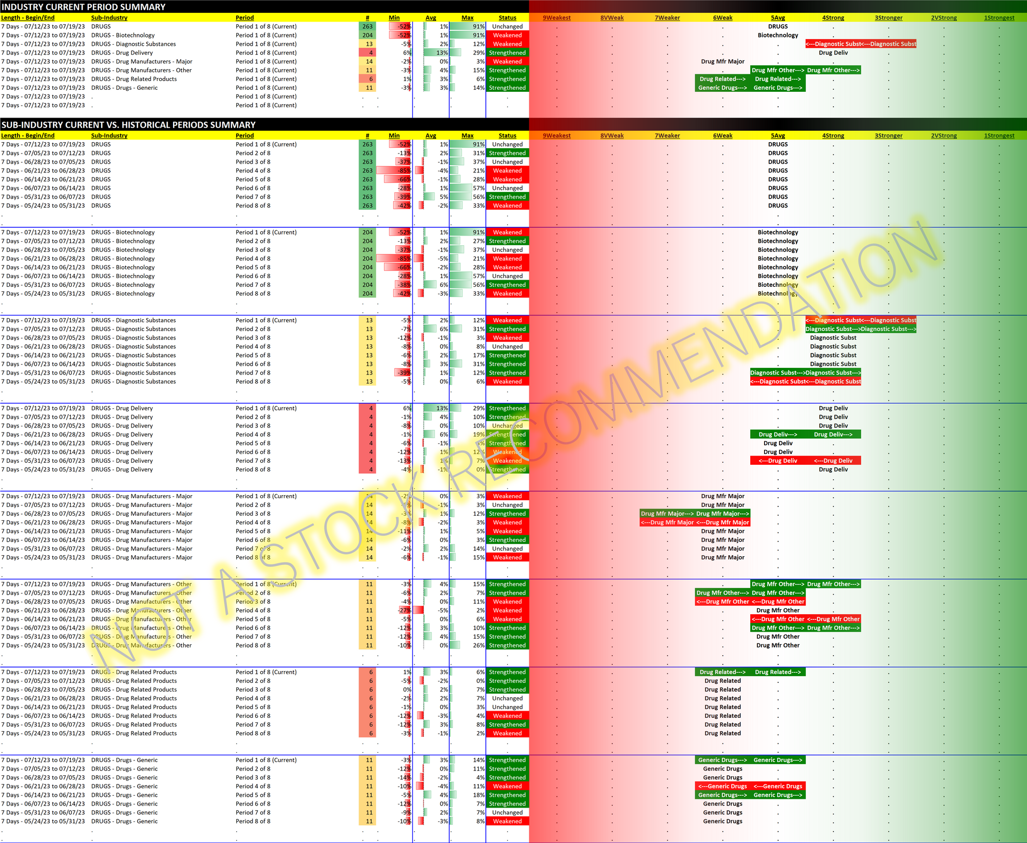Both Drugs and its by far largest sub-industry Biotechnology have exhibited unchanged strength for the past eight weeks. This belies the feast or famine (seeming) nature of underlying Biotechnology stocks, which during the past week of trading ending 2023-07-19 had one stock rising 91% and another falling 52%.