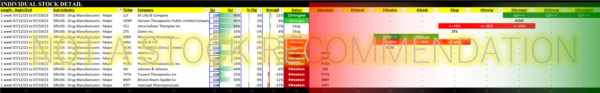 Home of PFE/Pfizer, MRK/Merck, and JNJ/Johnson & Johnson. Overall Weak rating (6th strongest of nine levels) and has generally been treading water for the past eight weeks.