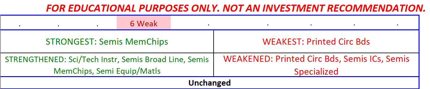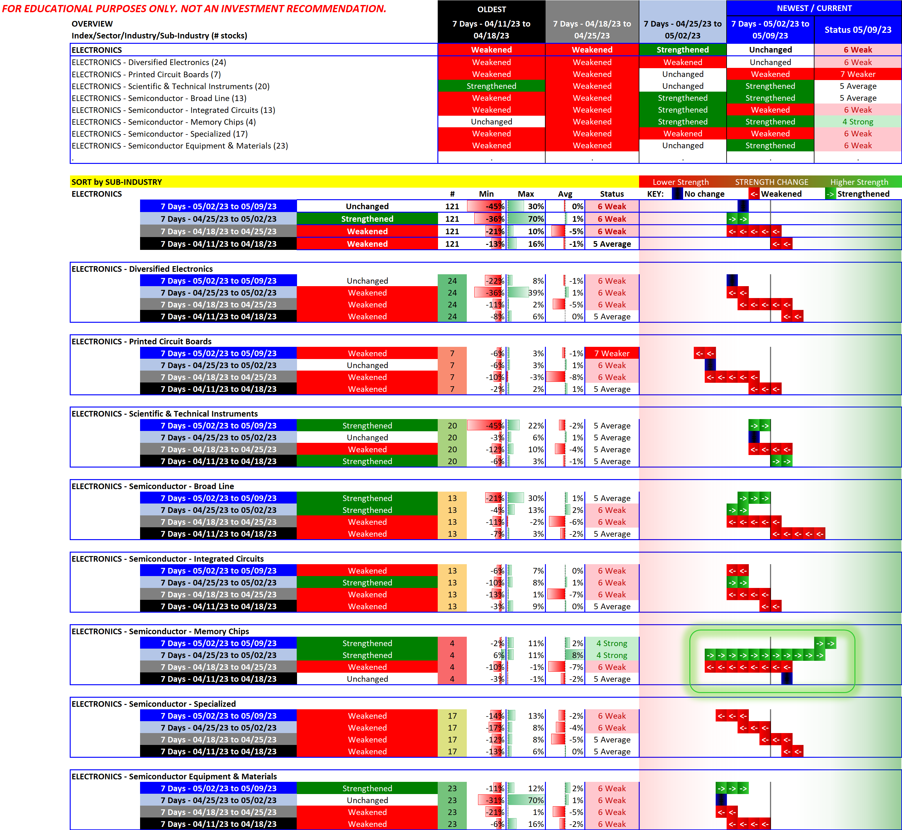 Here's a follow-up to my previous Electronics-focused post. After the close today May 9, 2023, Electronics was unchanged over the past week and has a Weak strength rating (The lowest rating is Weakest, above that is Very Weak, then Weak). The industry micro-summary for context:
