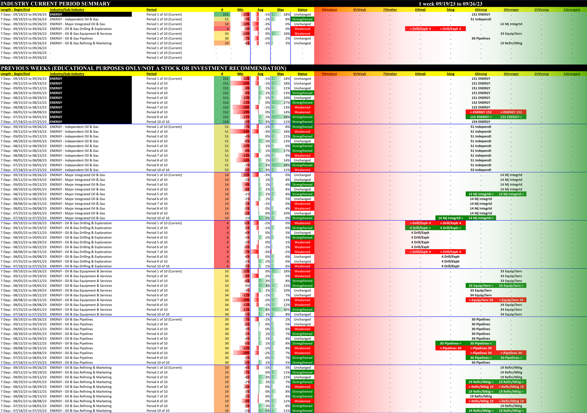 What: recent week-by-week strength changes for the industry and each underlying sub-industry