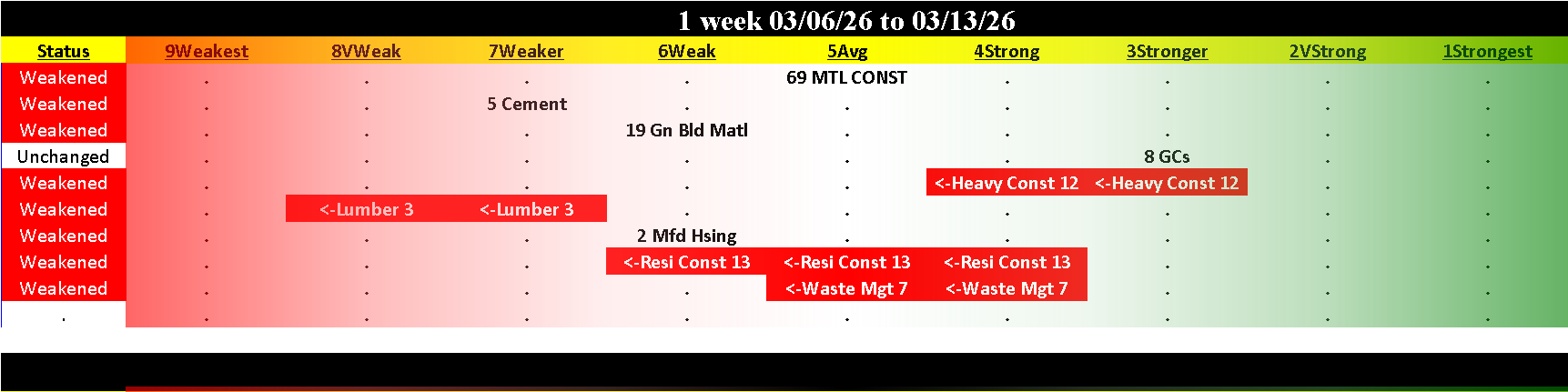 This post shows strengthening/weakening detail for this week for this industry and its sub-industries. Green shading shows industries, sub-industries, and/or stocks that strengthened ratings this week, red shows those that weakened ratings.