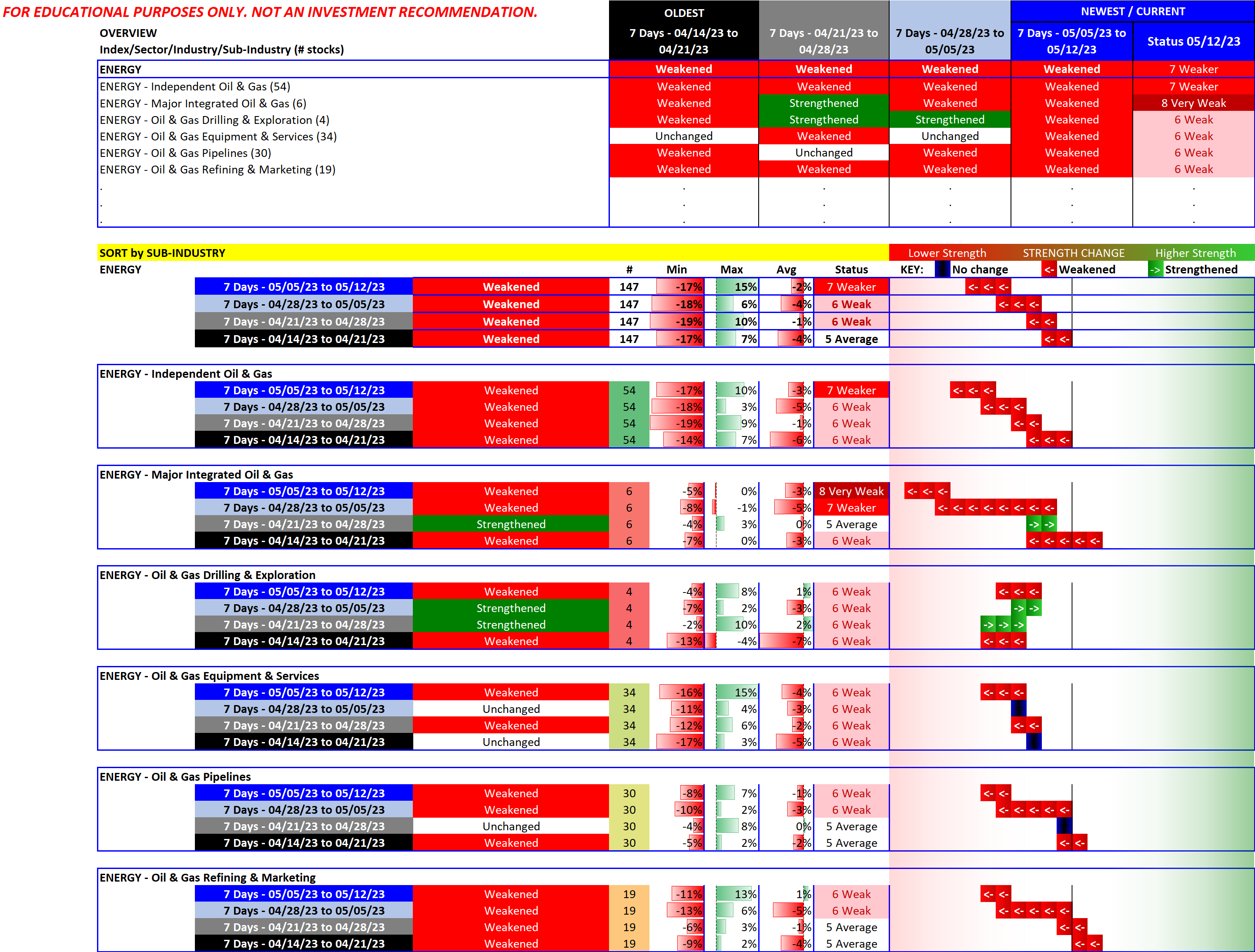 ENERGY industry status: WEAKENED over the past week, rating = "WEAKER." (Compare this to the last time I reviewed Energy.)