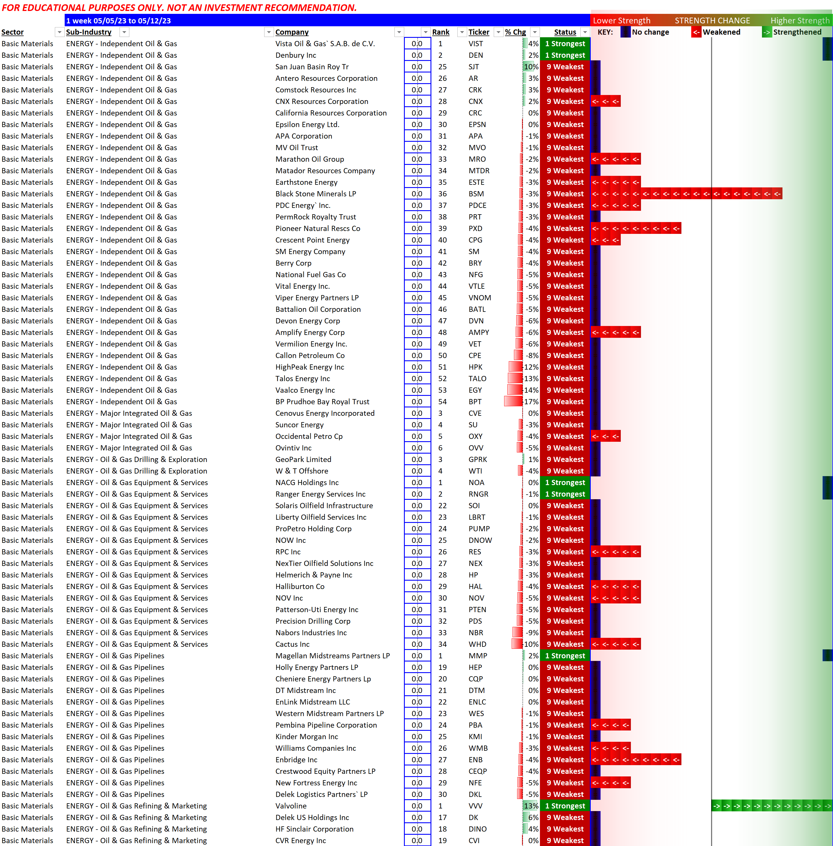 Only 6 stocks rated "Strongest" (<10% of the “Weakest”): VIST, DEN, NOA, RNGR, MMP, VVV. Major Integrated Oil & Gas = Very Weak overall (XOM, CVX, CVE, SU, OXY, OVV).