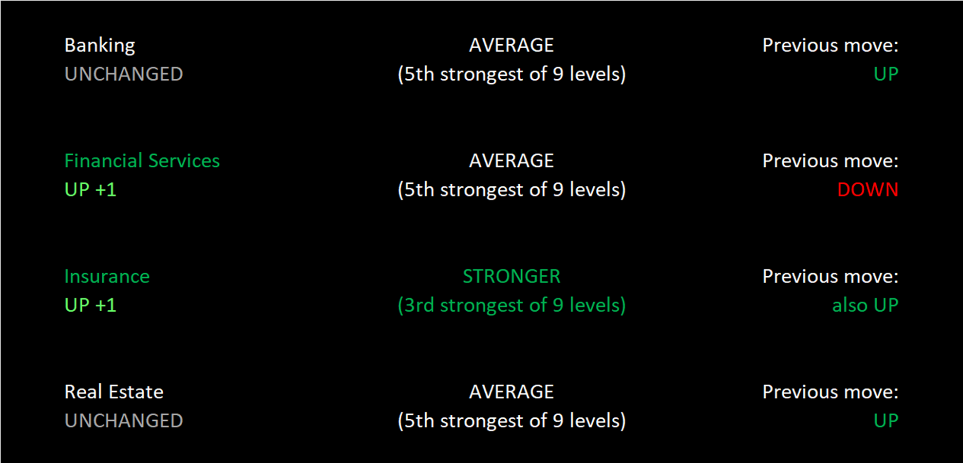 The Financial Sector strengthened +0.3 points to a 4.7 composite score this week as two of four industries strengthened rating (Financial Services and Insurance) while the other two strengthened but not enough to change rating (Banking and Real Estate).