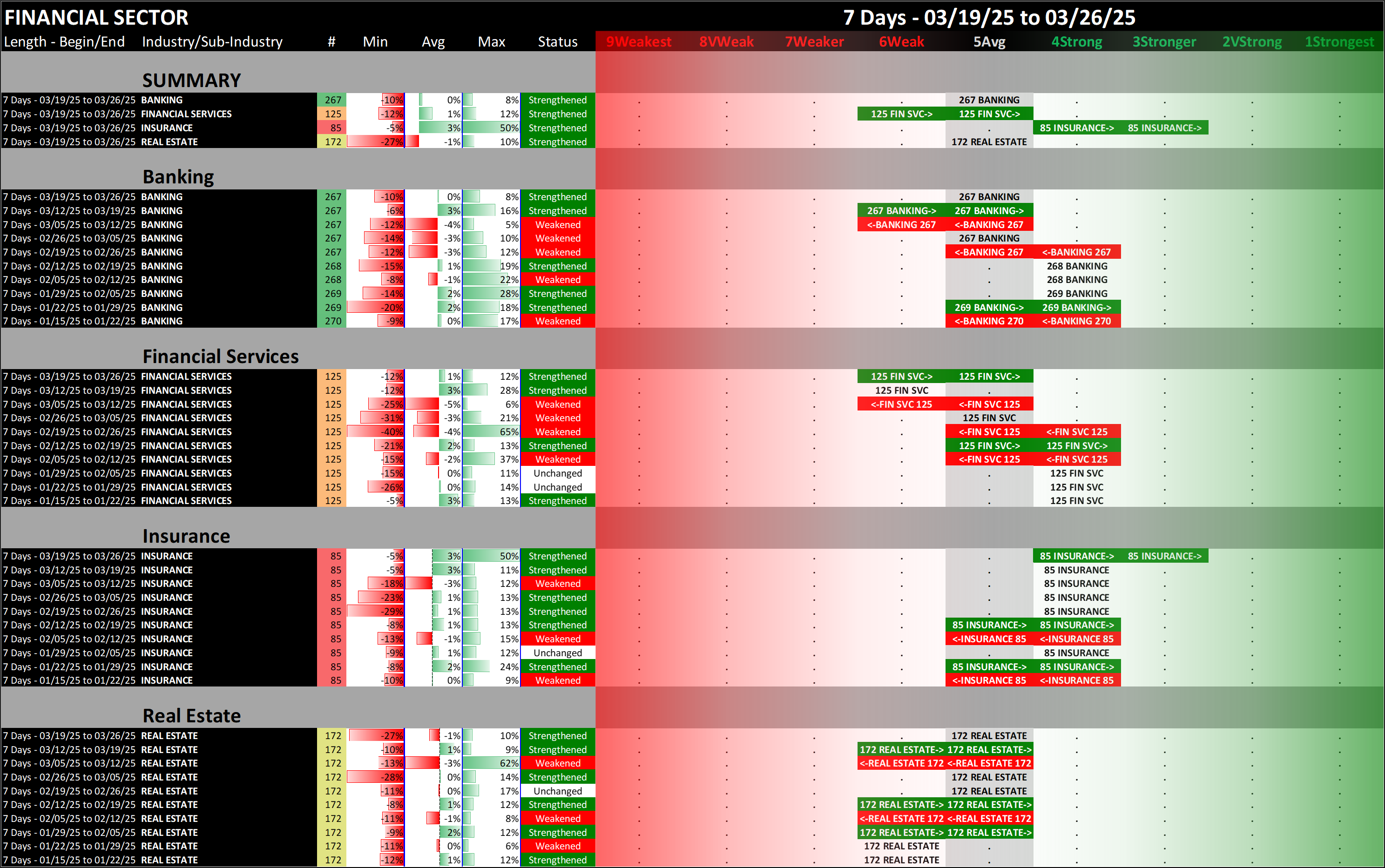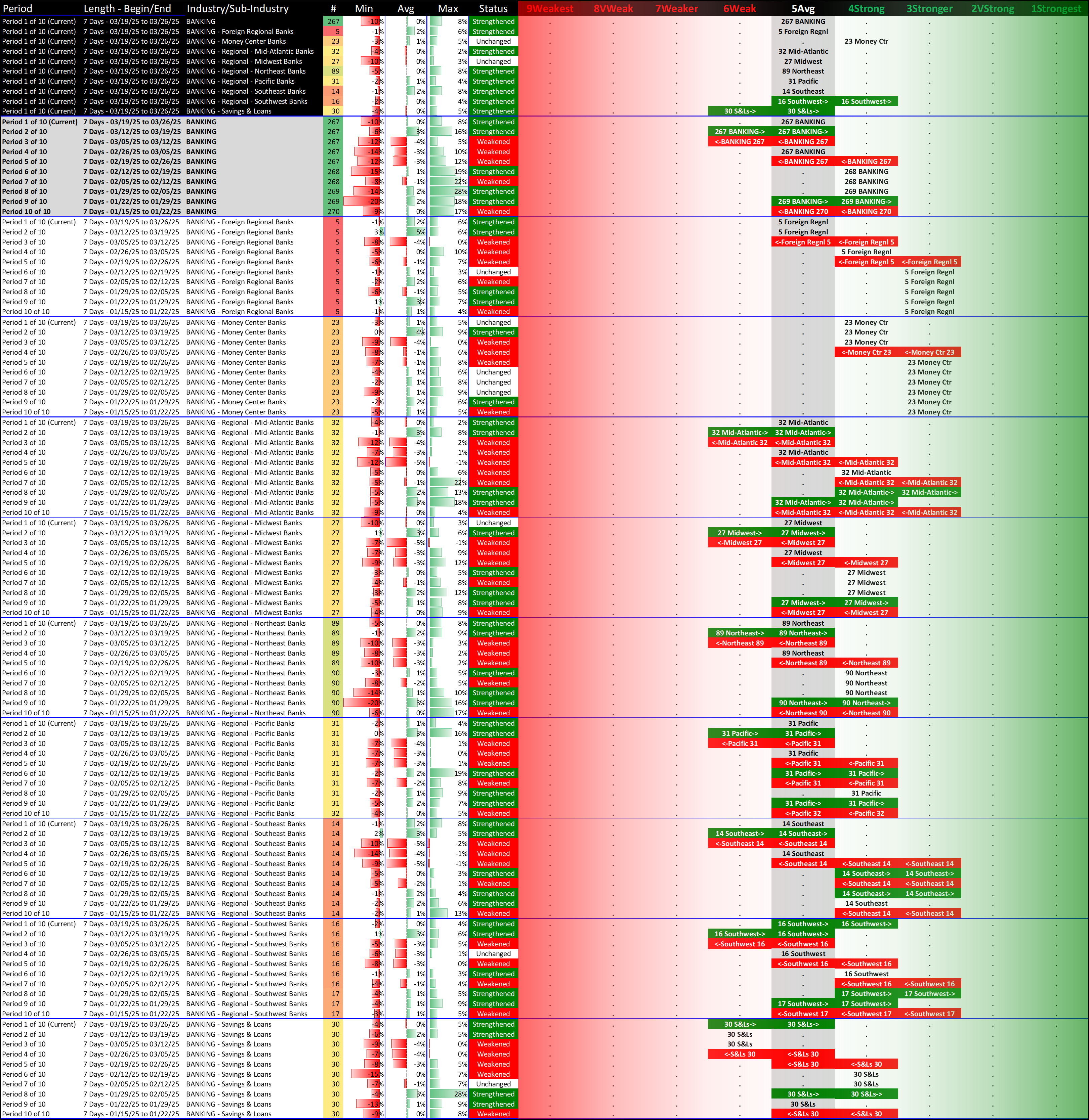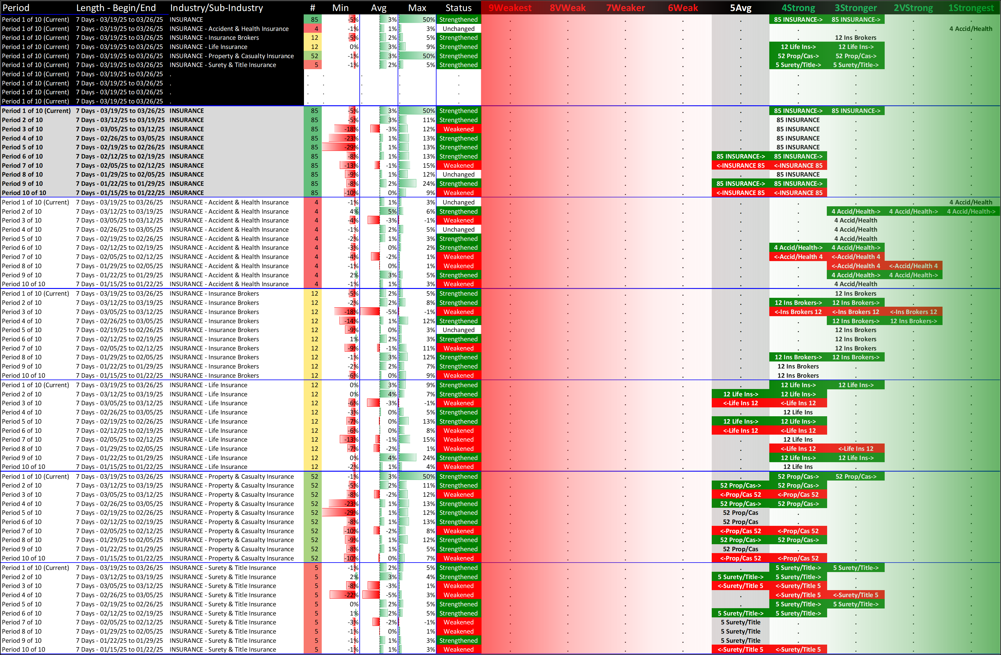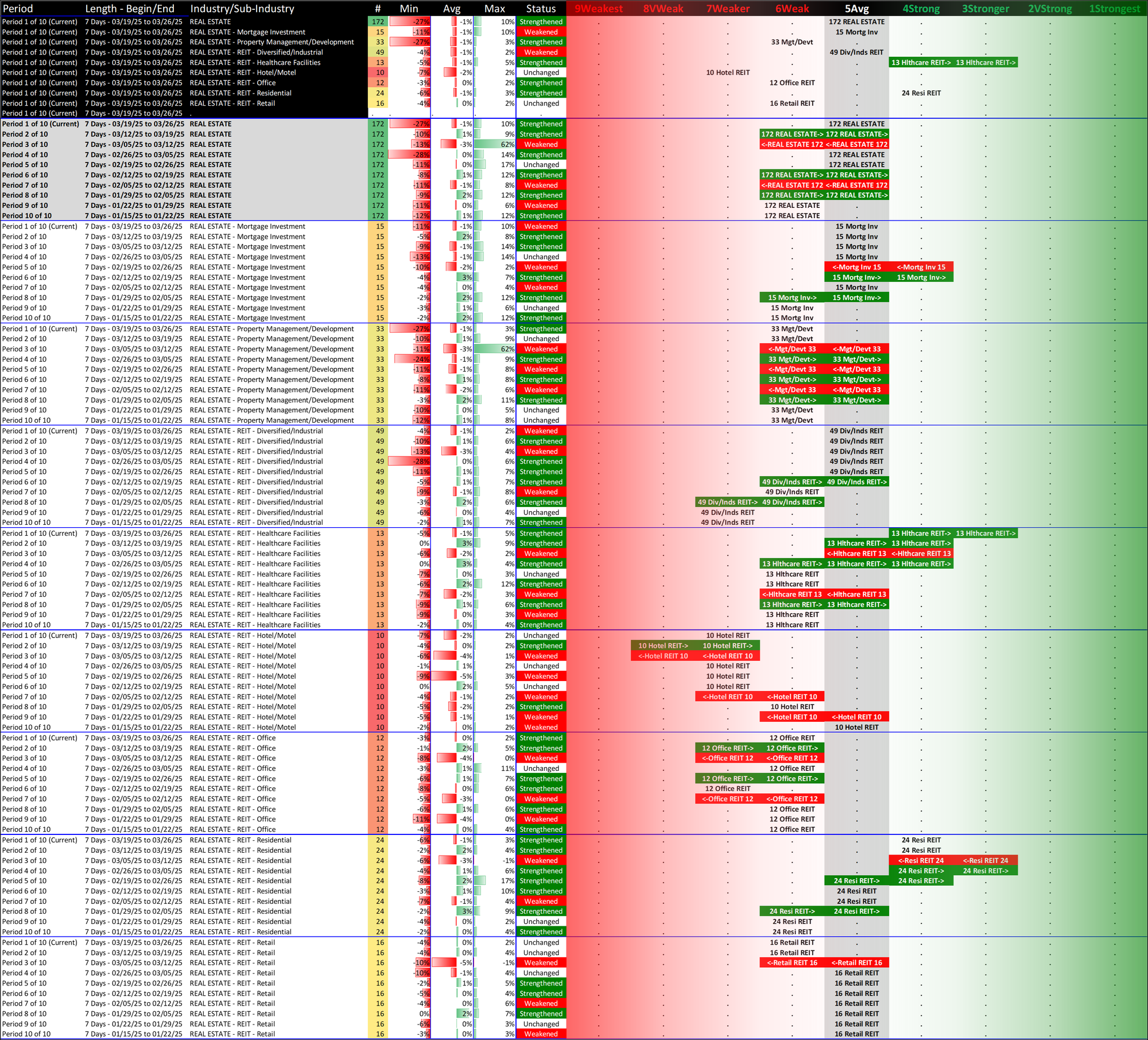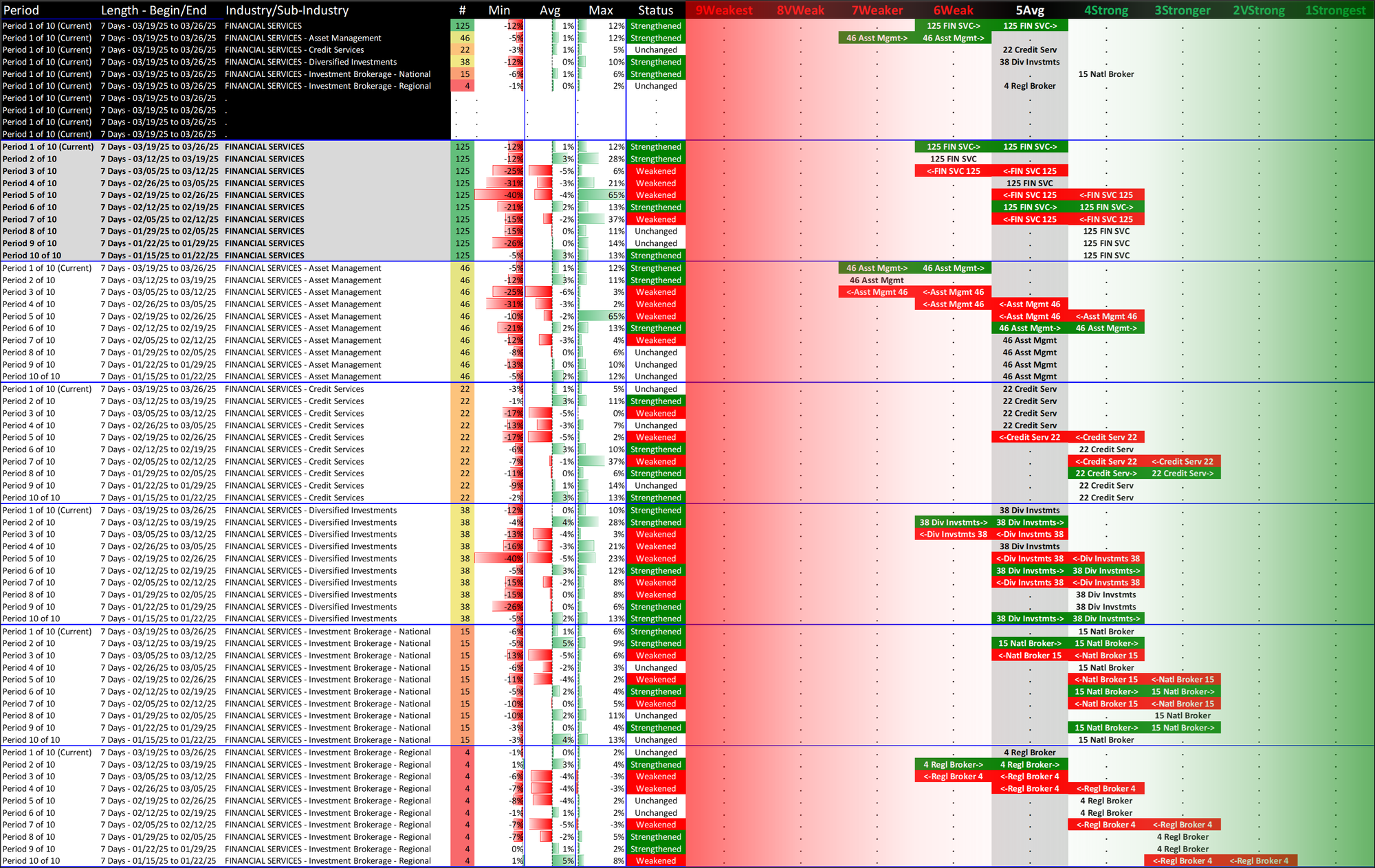What: recent week-by-week strength changes for the industry and its sub-industries