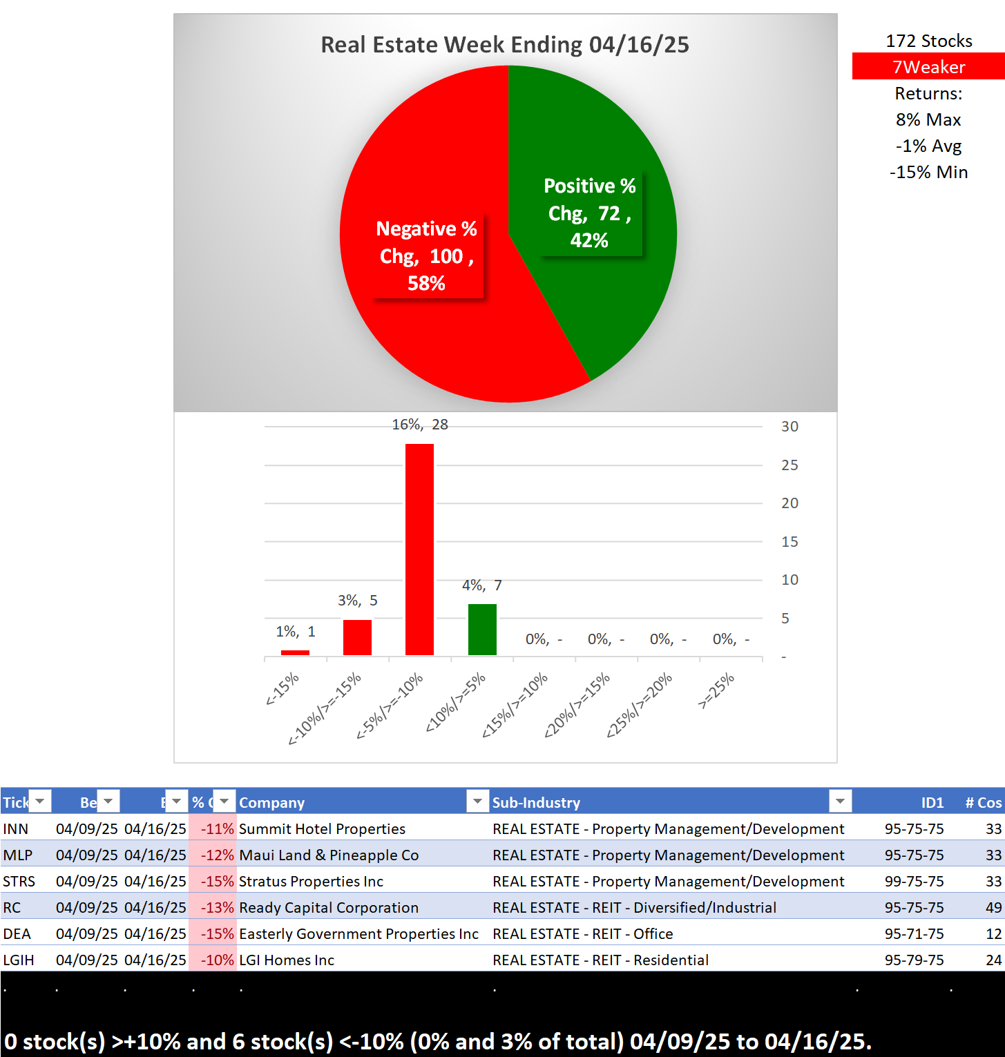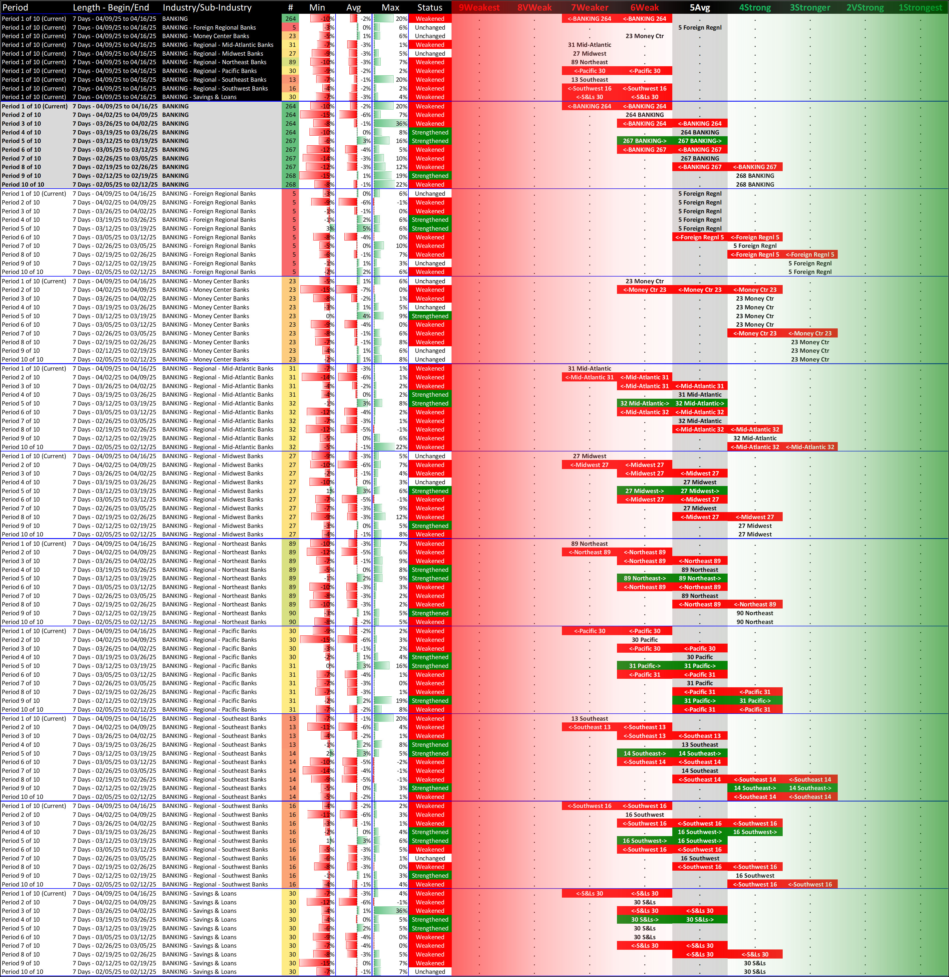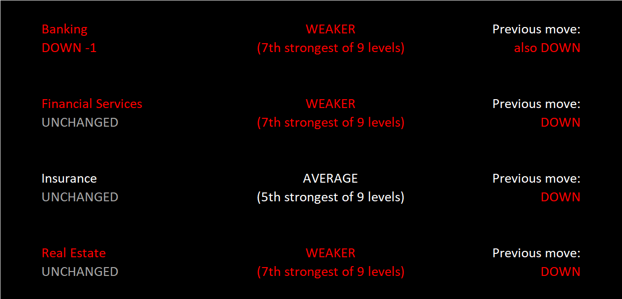 Per yesterday's ETF strength analysis, both XLF/Financials and XLRE/Real Estate are at 6Weak with both strengthening one rating. In today's larger universe analysis, one of four industries weakened rating (Banking) and three of four are at 7Weak (Banking, Financial Services, and Real Estate). Insurance leads at 5Average.