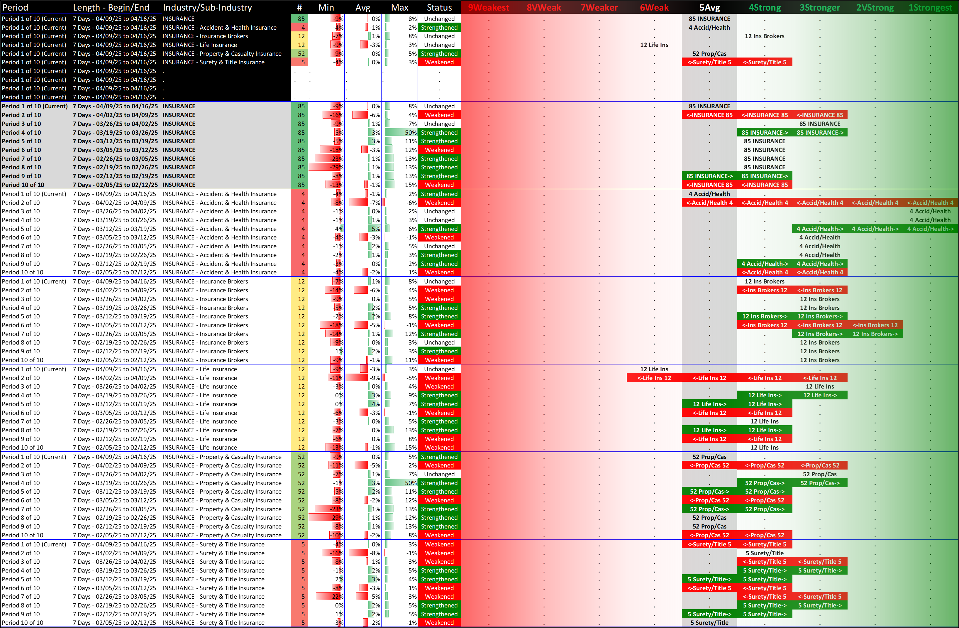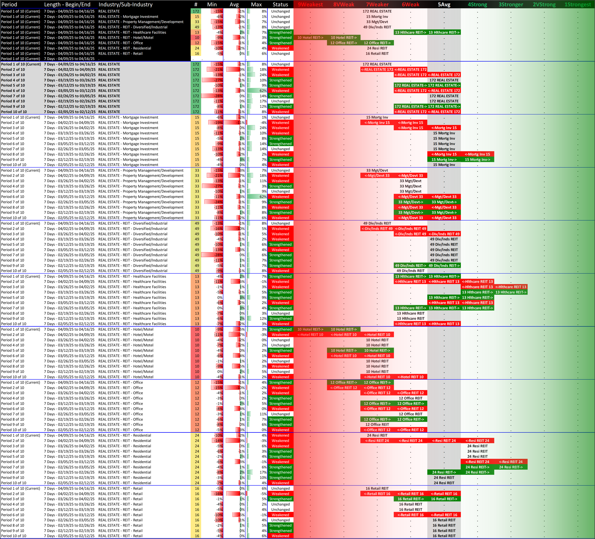 What: recent week-by-week strength changes for the industry and its sub-industries