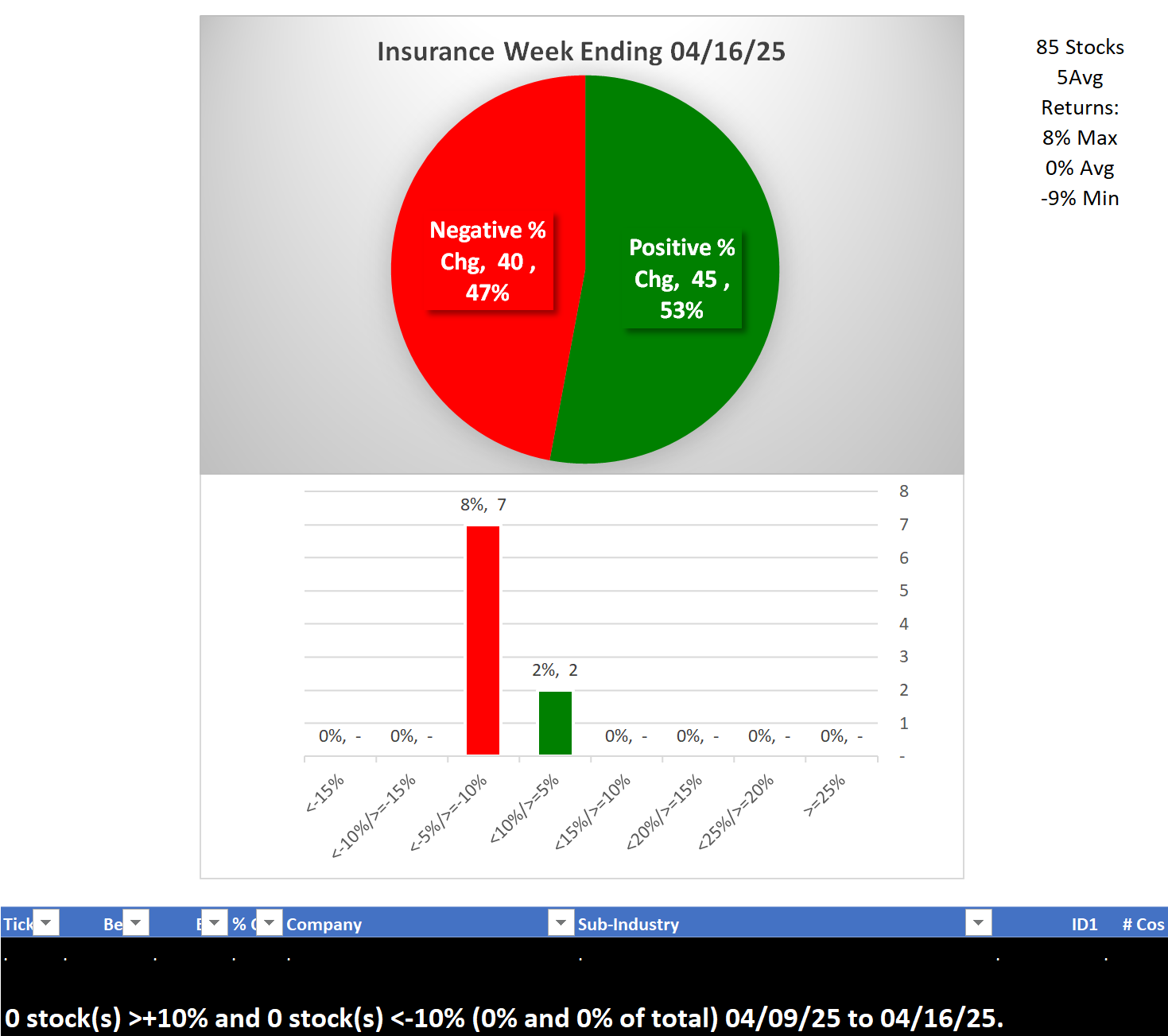 Top 10 Market Caps: BRKA/Berkshire Hathaway Cl A, PGR/Progressive Corp, CB/Chubb Corp, MMC/Marsh & McLennan Cos Inc, AON/Aon PLC, AFL/Aflac Inc, AJG/Arthur J Gallagher & Co, MET/MetLife Inc, TRV/The Travelers Companies Inc, MFC/Manulife Financial Corp.