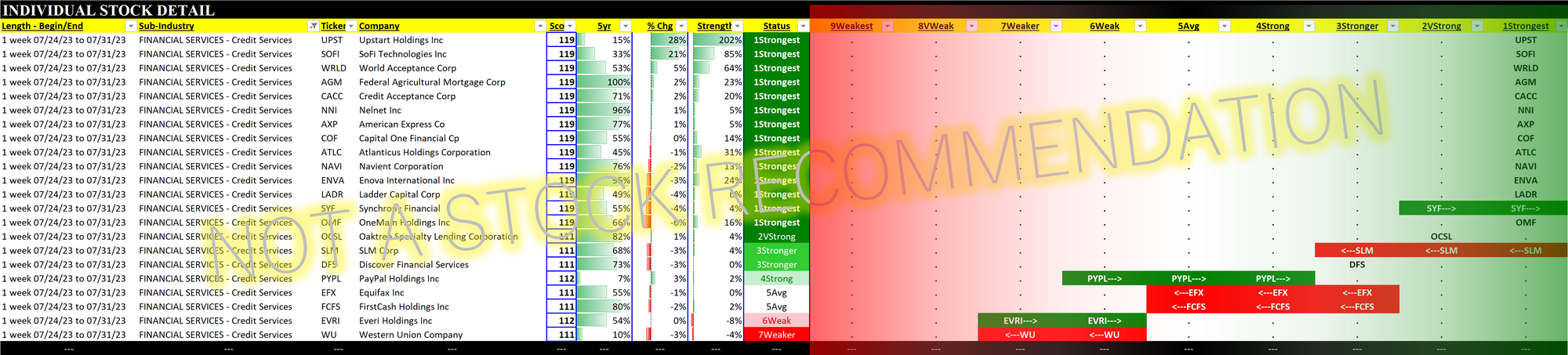 SOFI/SoFi Technologies jumped almost 20% today by (per Yahoo!) "reporting a surge in members in the second quarter and raising its full-year outlook." Cherry-picking its recent low of May 16, 2023, this puts its gain through today July 31, 2023 at 141%. This is second behind only UPST/Upstart Holdings +254% during this period among all Credit Services stocks. Add both of these to the list of stocks that have enjoyed continued strong runs after enjoying strong rallies prior to that advance. Upstart increased 28% last week.