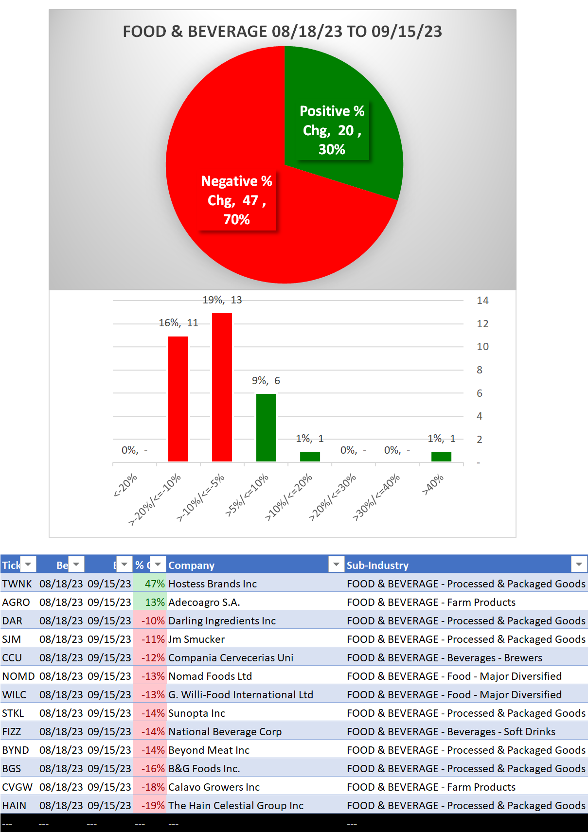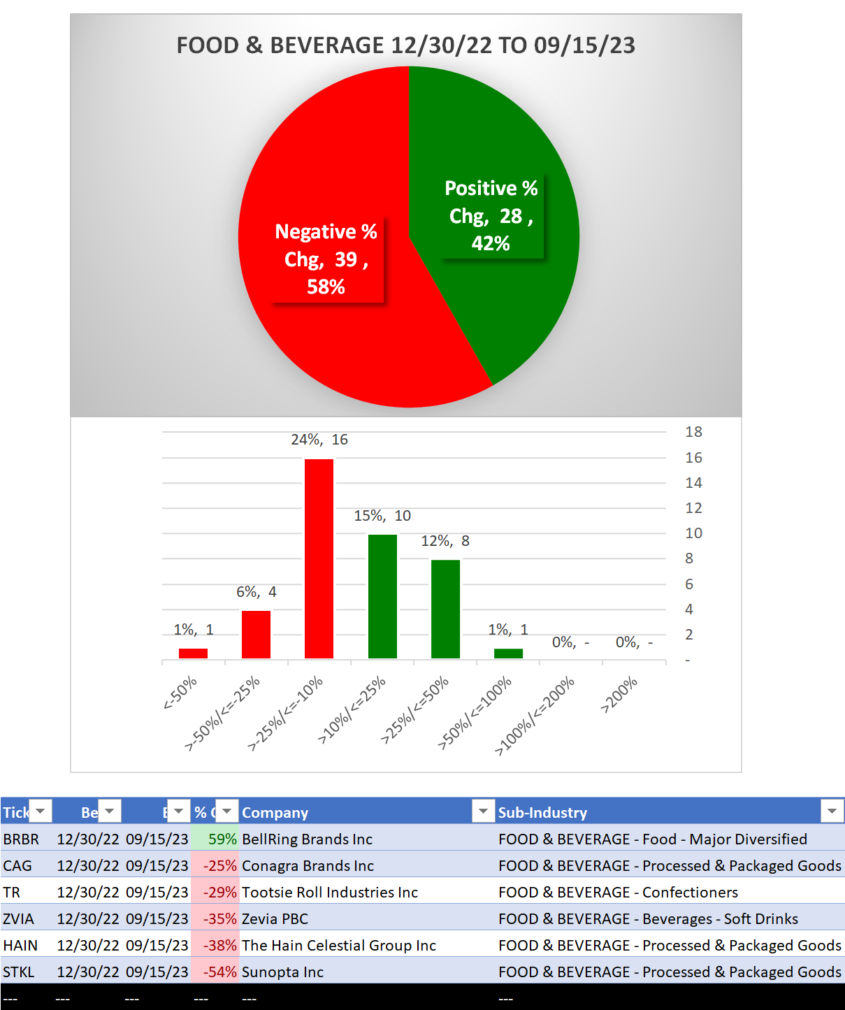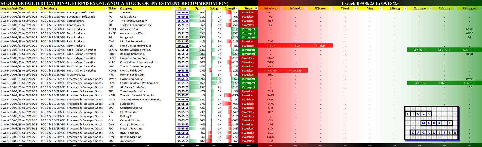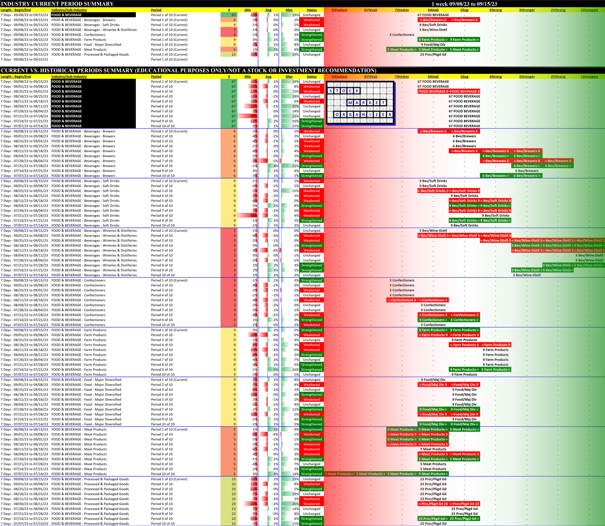 Food & Beverage 2023-09-15: Unchanged at WEAK strength rating (6th strongest of 9 levels), previous move was DOWN