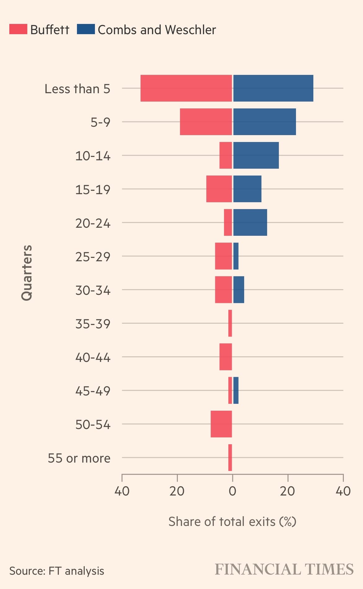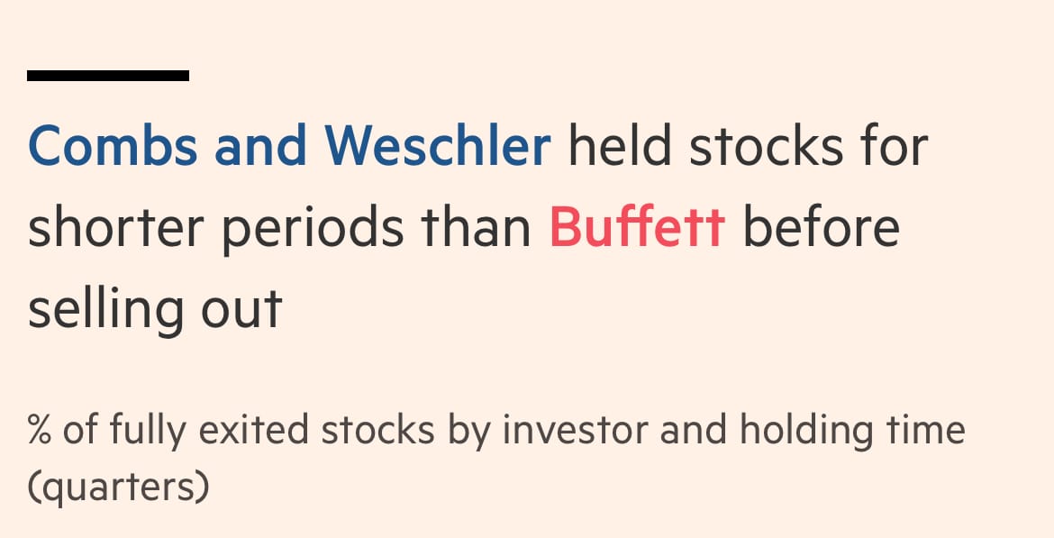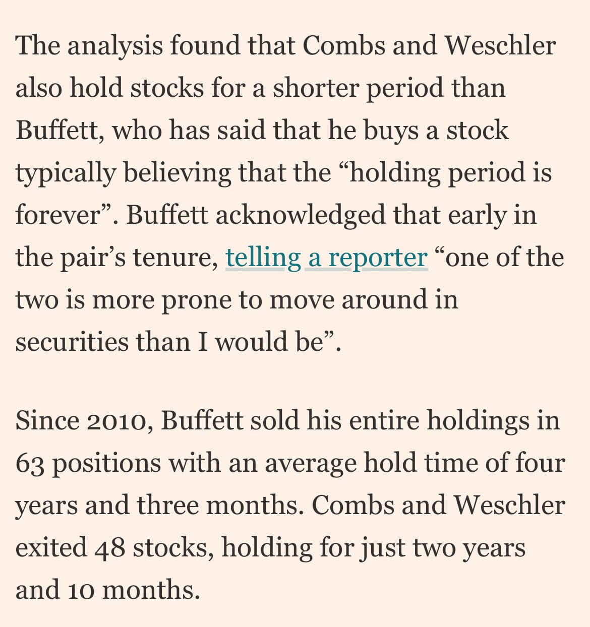 From a recent Financial Times article, a screen shot-heavy post. ("Combs" and "Weschler" noted in the screen shots are Warren Buffett's hand-picked Berkshire Hathaway successors.) Many Oracle of Omaha fans like to cite his "favorite holding period" quote (that is, "forever") as a rule to follow. Does reality reflect the oft-cited quote? Spoiler alert: no. Of course this doesn’t negate his genius. But for me it calls into question whether everything he says needs to be taken literally. As many do take his proclamations. Perhaps this is an example of needing to know the rules to best be able to break them.