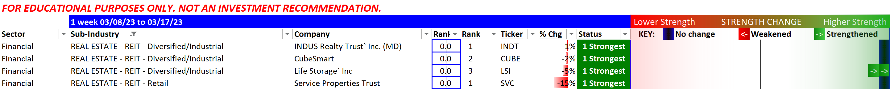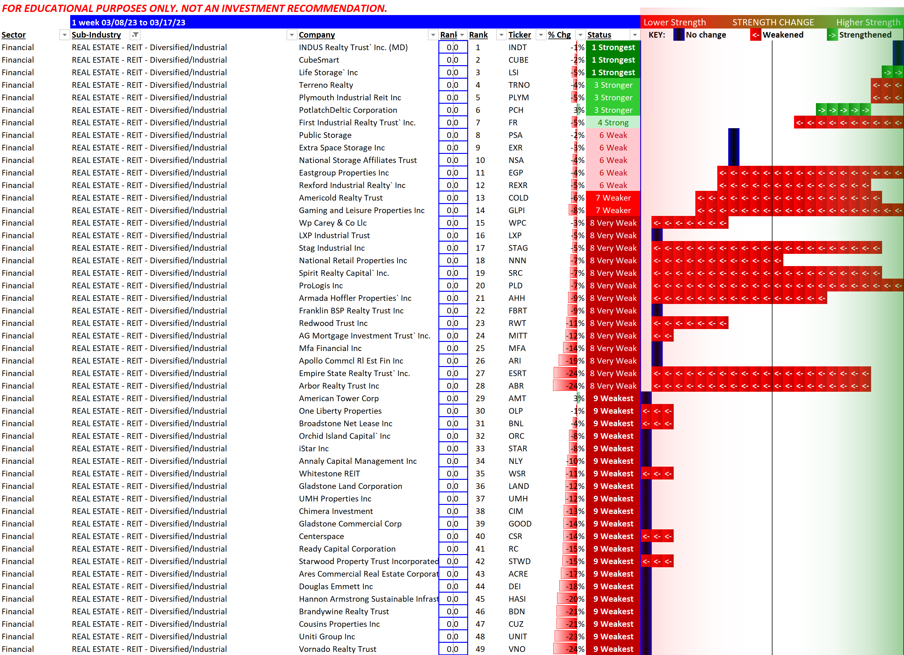 The top one listed here (INDT) is being acquired. Storage company stocks have migrated to the top, with CubeSmart/CUBE and LifeStorage/LSI holding the highest strength ratings. This is the home of Vornado Realty Trust/VNO which has cratered to multi-decade lows.