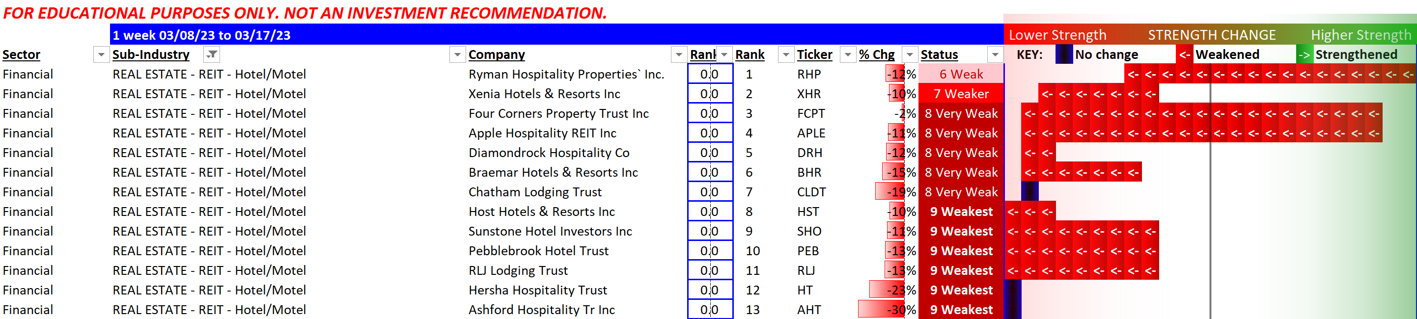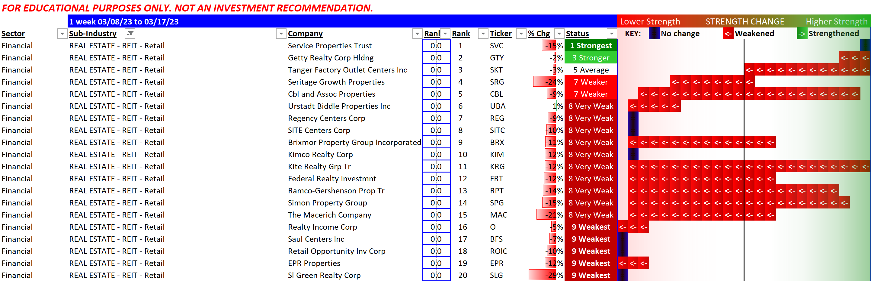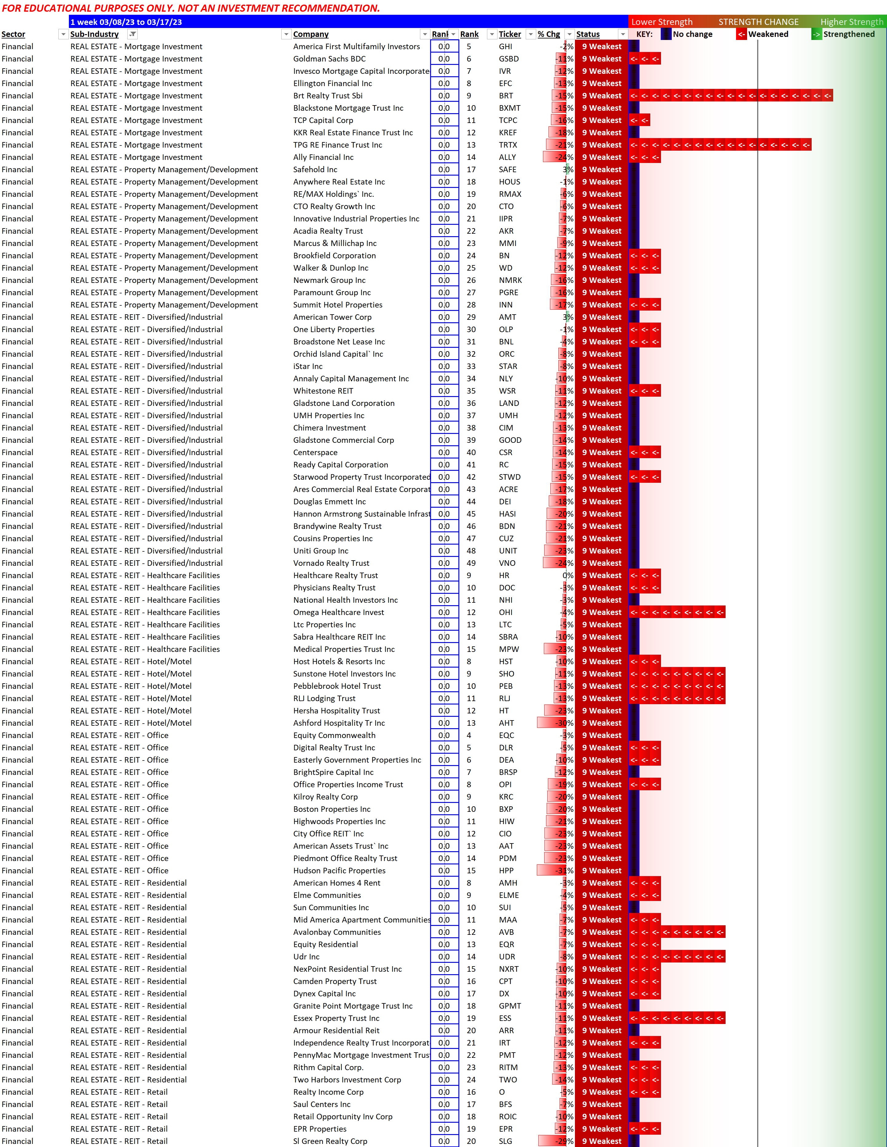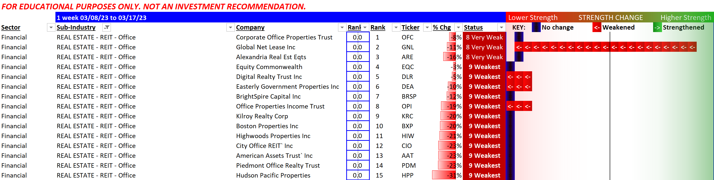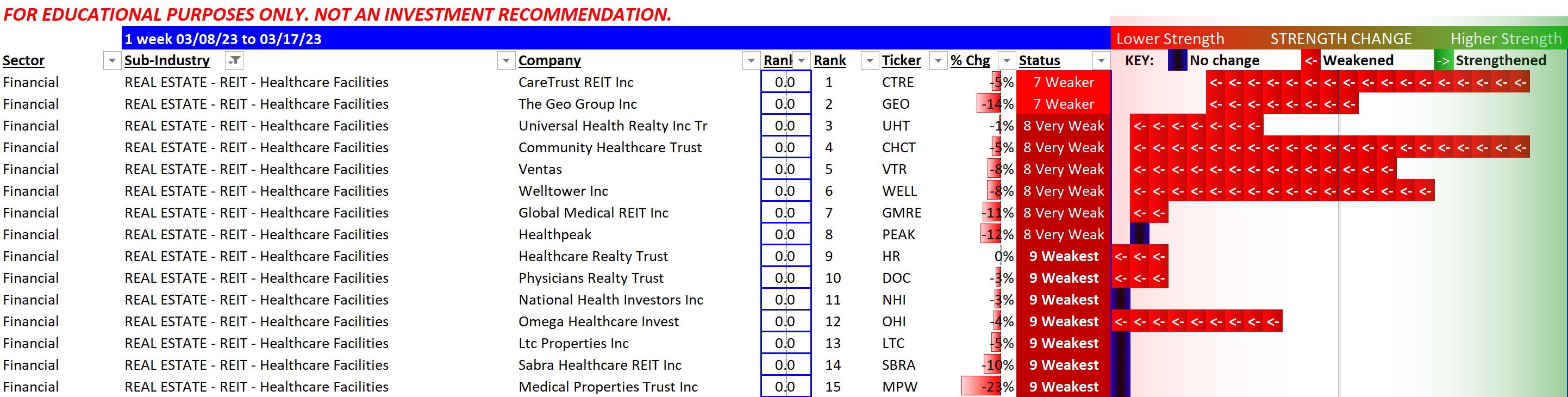 Negative performance all around since 3/8/23, except for Healthcare Realty Trust/HR which managed to break even. Though it still has the weakest rating.