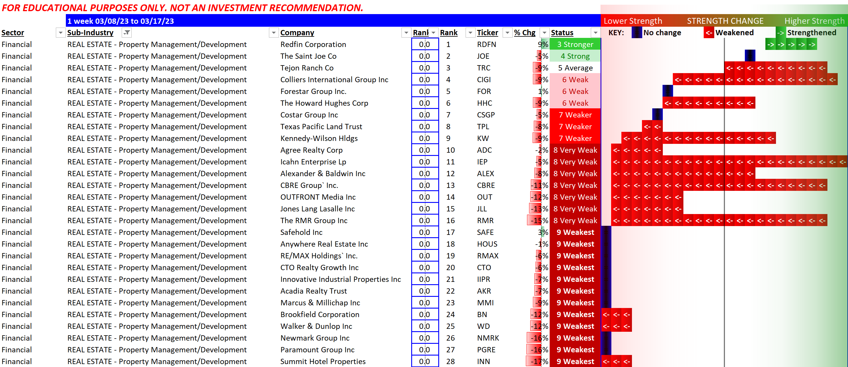 The following two charts provide a quick summary of the current best and worst in the Real Estate industry. A huge imbalance toward weak stocks. Of the eight Real Estate sub-industries, there are only two that have stocks with the highest strength score.