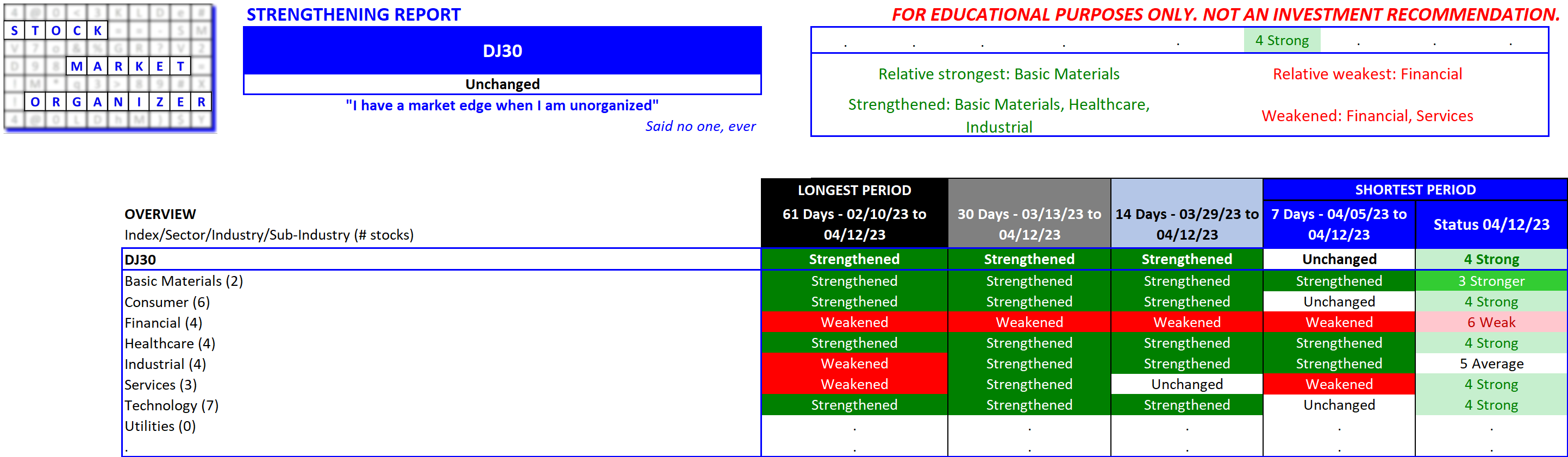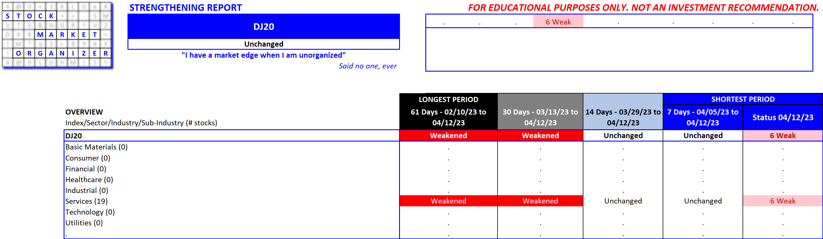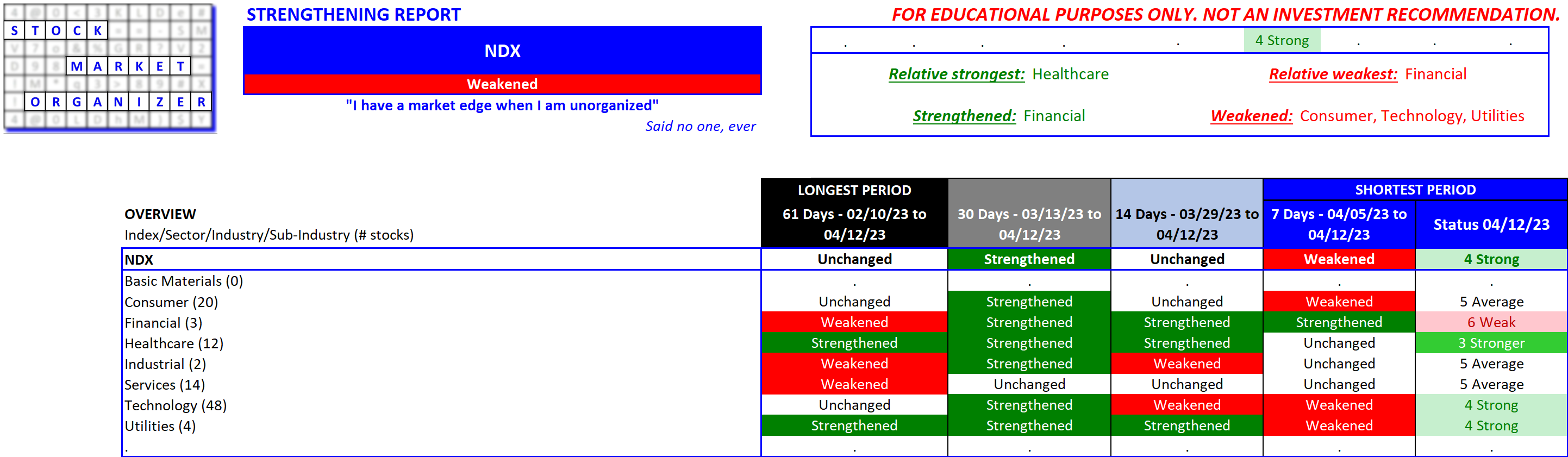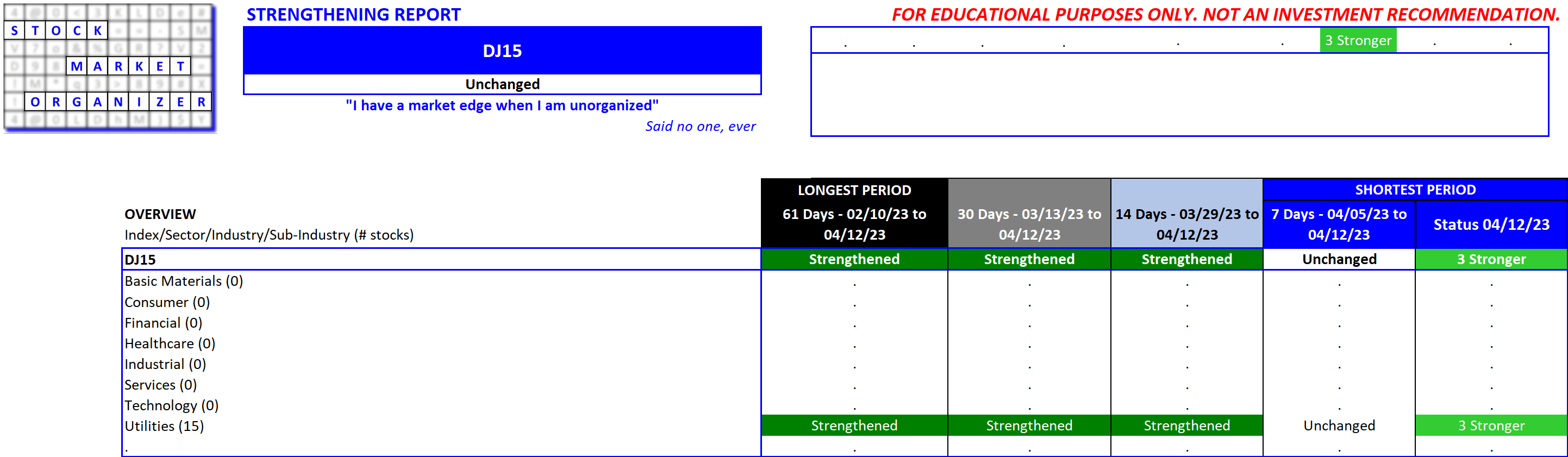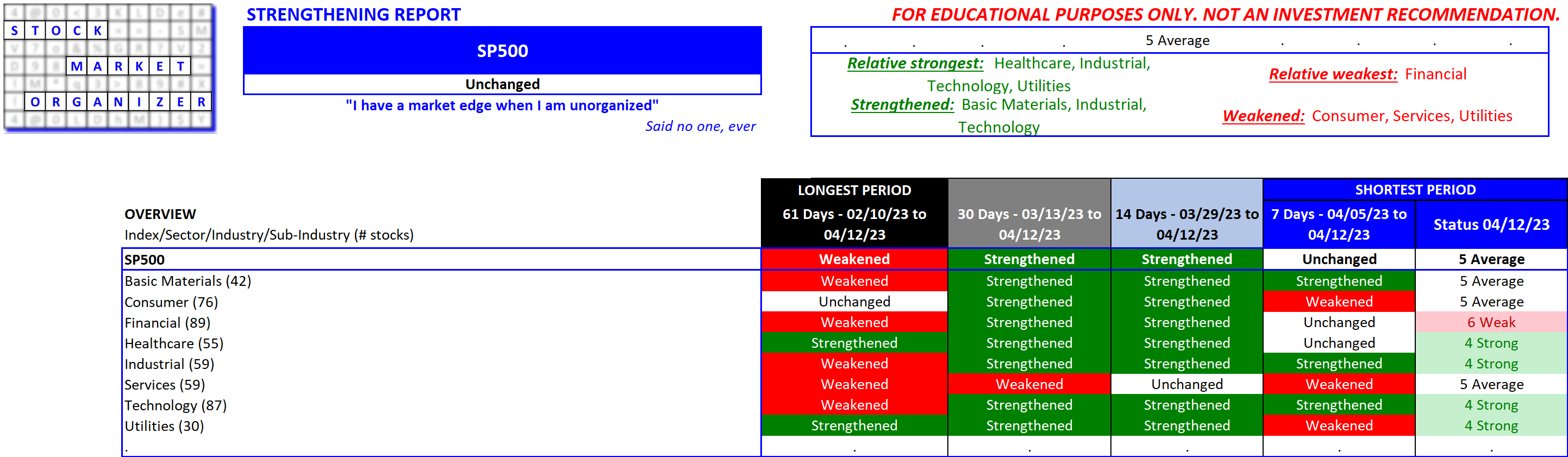 Applied to industry, sub-industry, and stock levels, this method provides clear value: a clear competitive edge against your stock market competition. Every time you buy/sell a stock, the seller/buyer is taking the exact opposite stance as you. Which of you is using the more valuable information for your decisions?