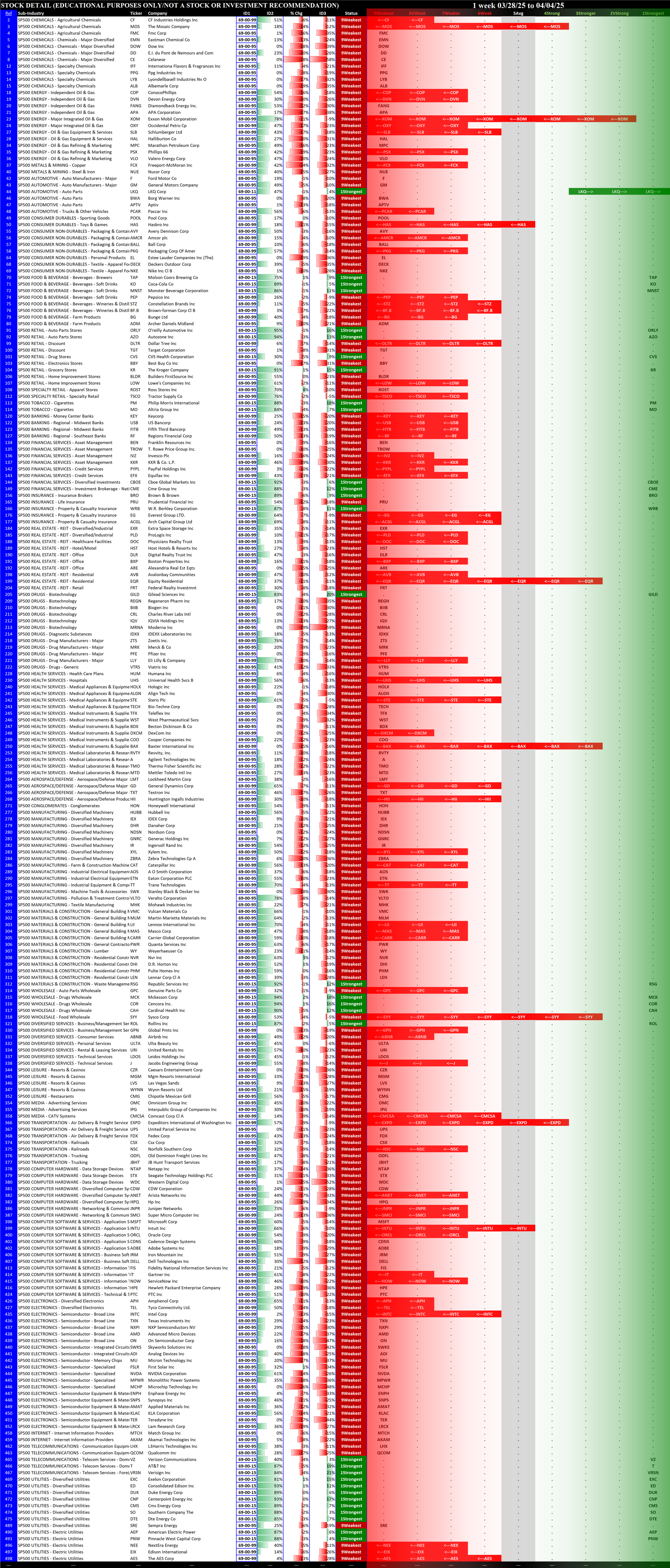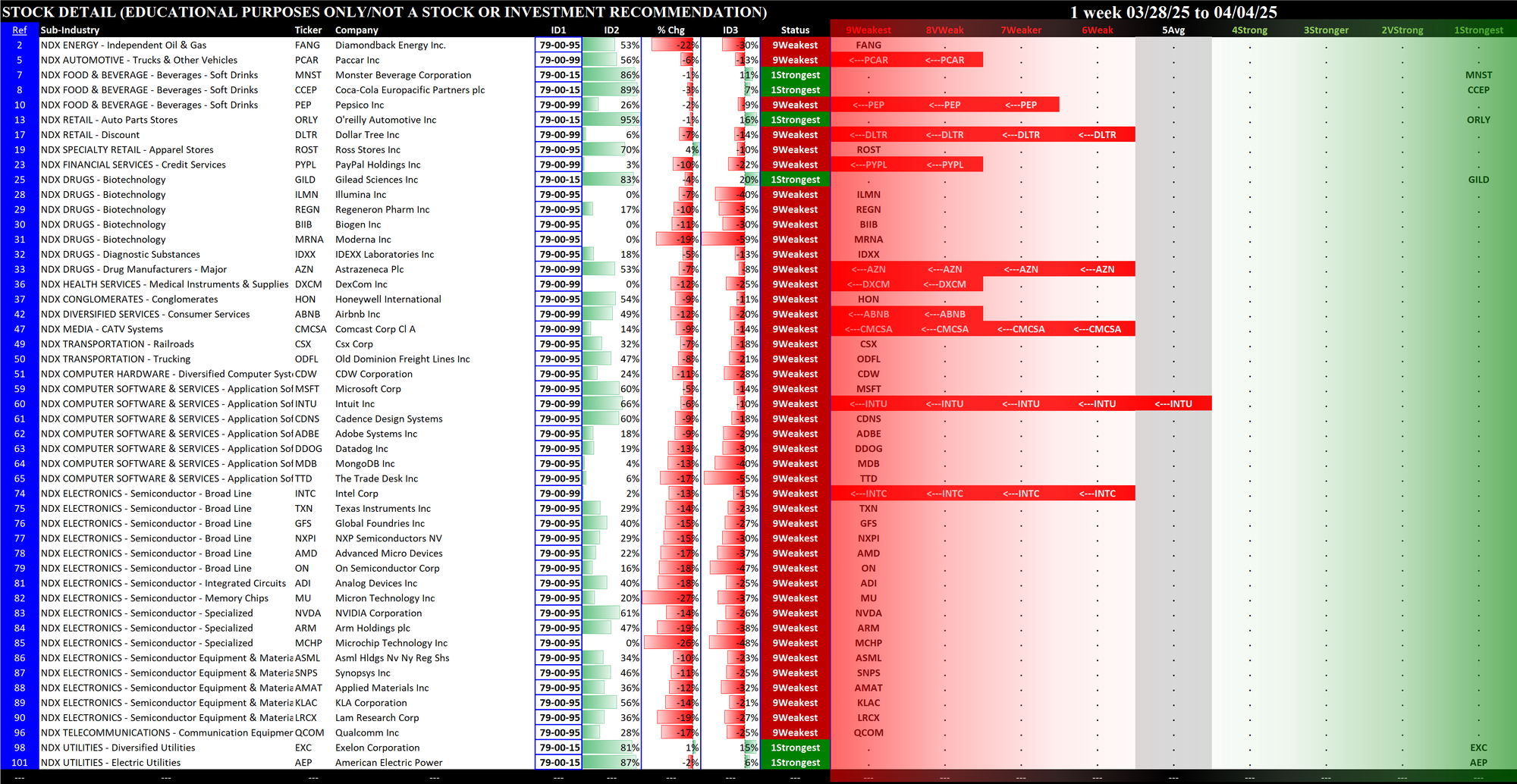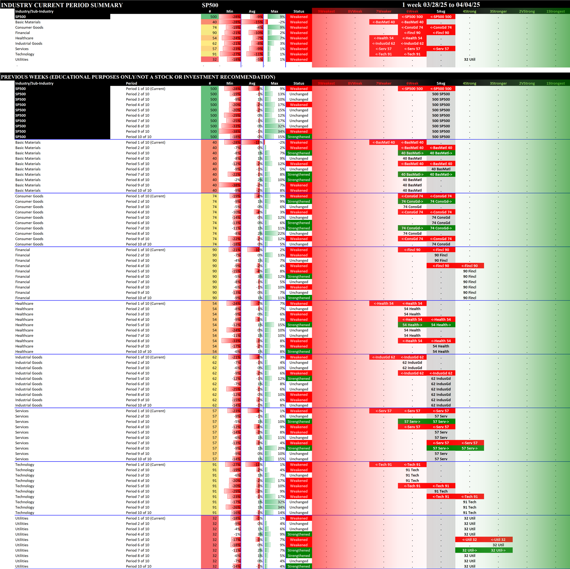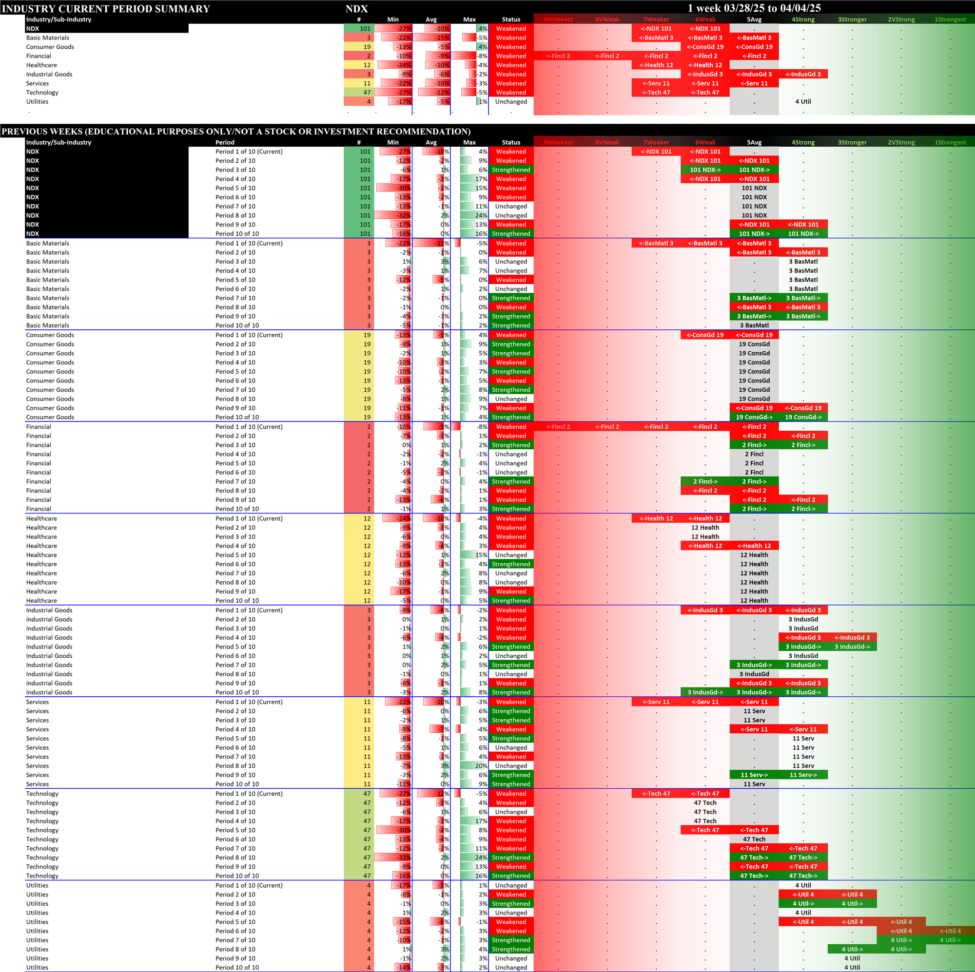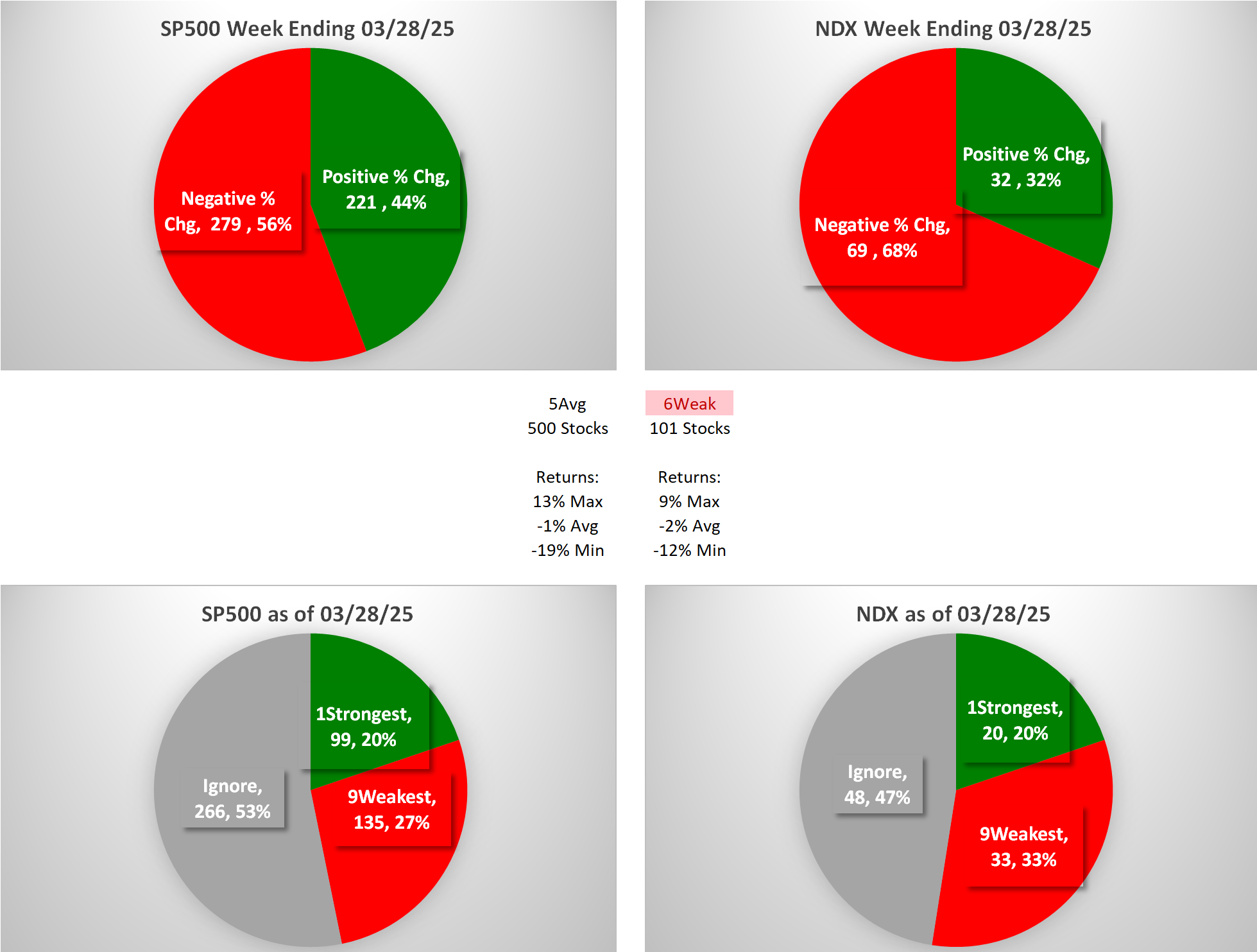 This analysis provides a Stock Market Organizer summary view of the S&P 500 and Nasdaq 100 for the week ended Friday, 04/04/25. This means this is a stock-by-stock strength analysis of the component stocks for each index, aggregated upward in level to the sector and index levels.