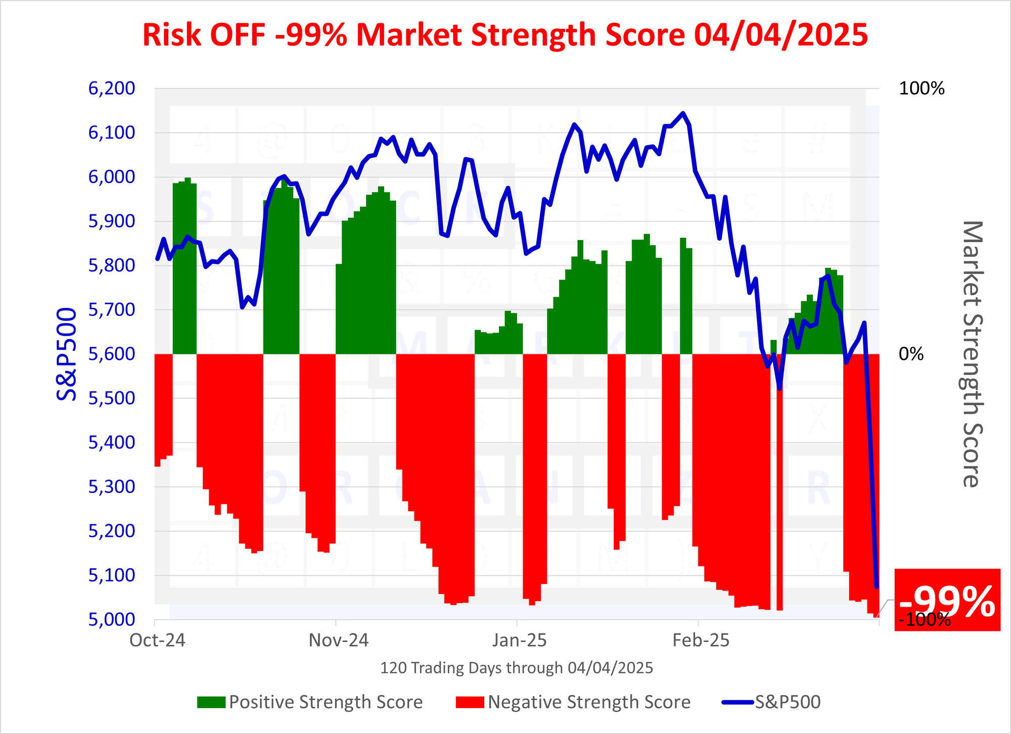 Today's Market Strength Score and Sector Risk Gauge reflect an extreme -99% reading, just below the lowest possible -100% score: