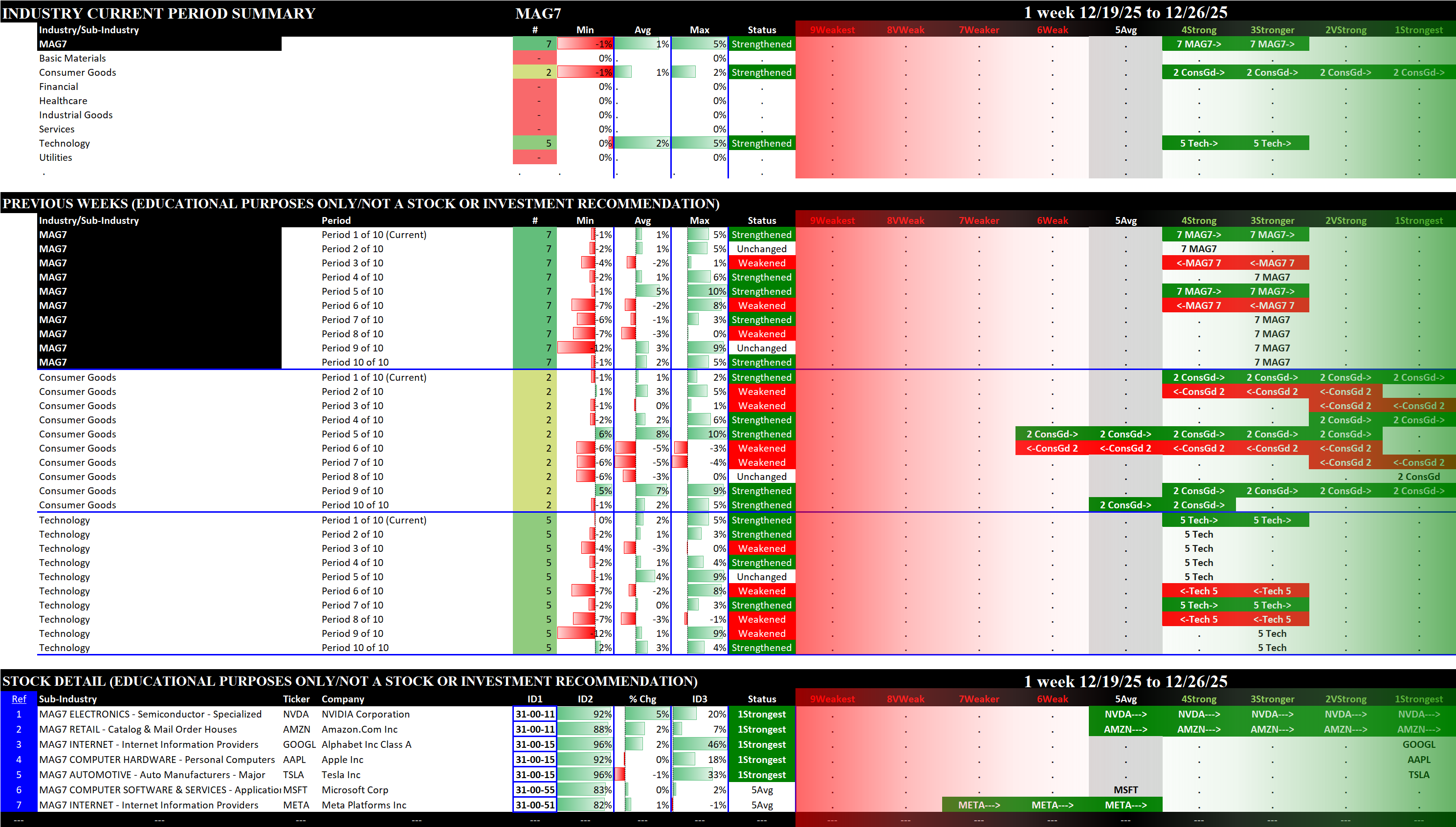 This post shows strengthening/weakening detail for this week for the S&P 500, Nasdaq 100, the Philadelphia Semiconductor Index (SOX), and the so-called Magnificent 7 stocks (MAG7).