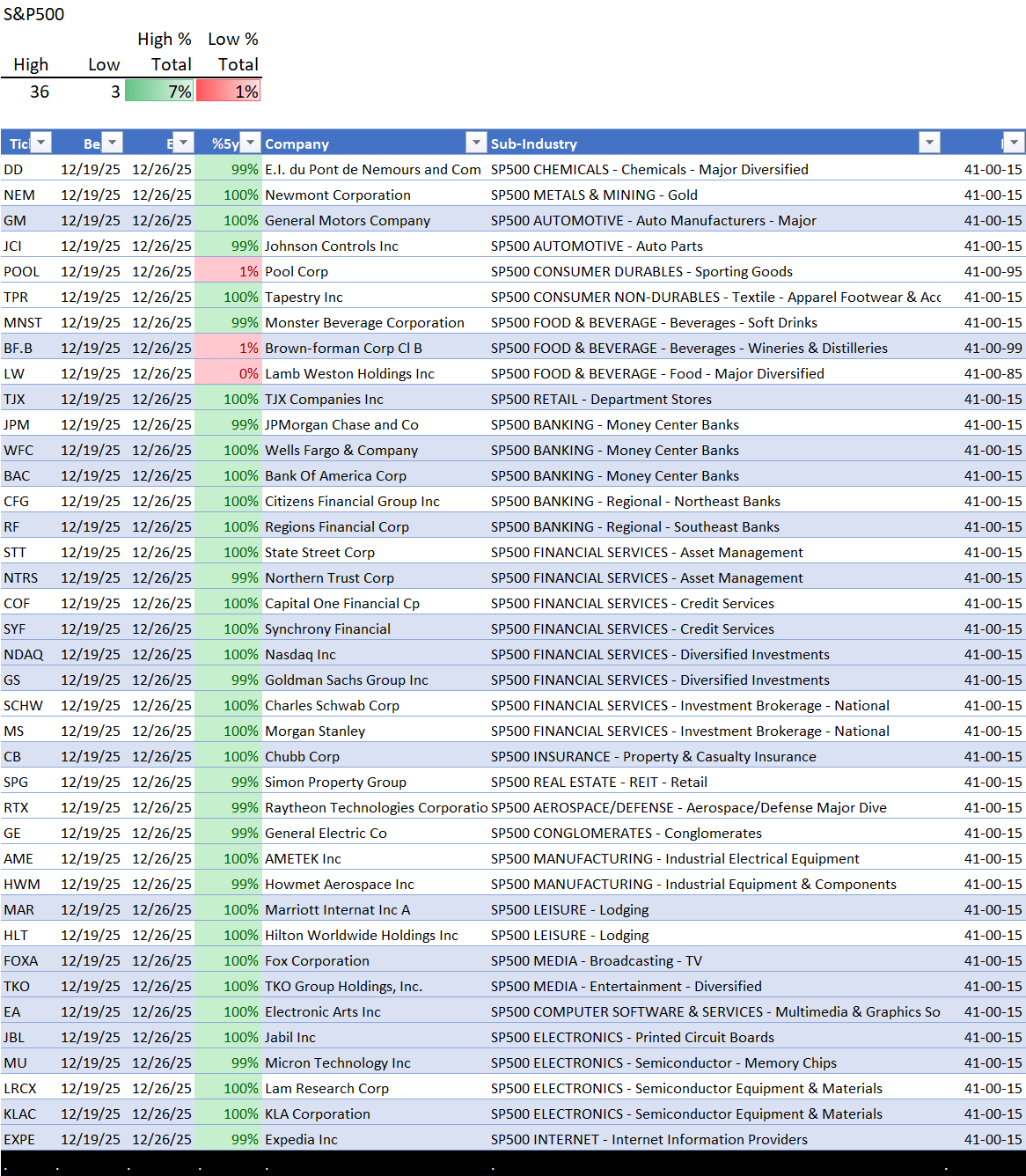 Grouped by sector then industry then sub-industry, prior weeks shown to highlight new changes.