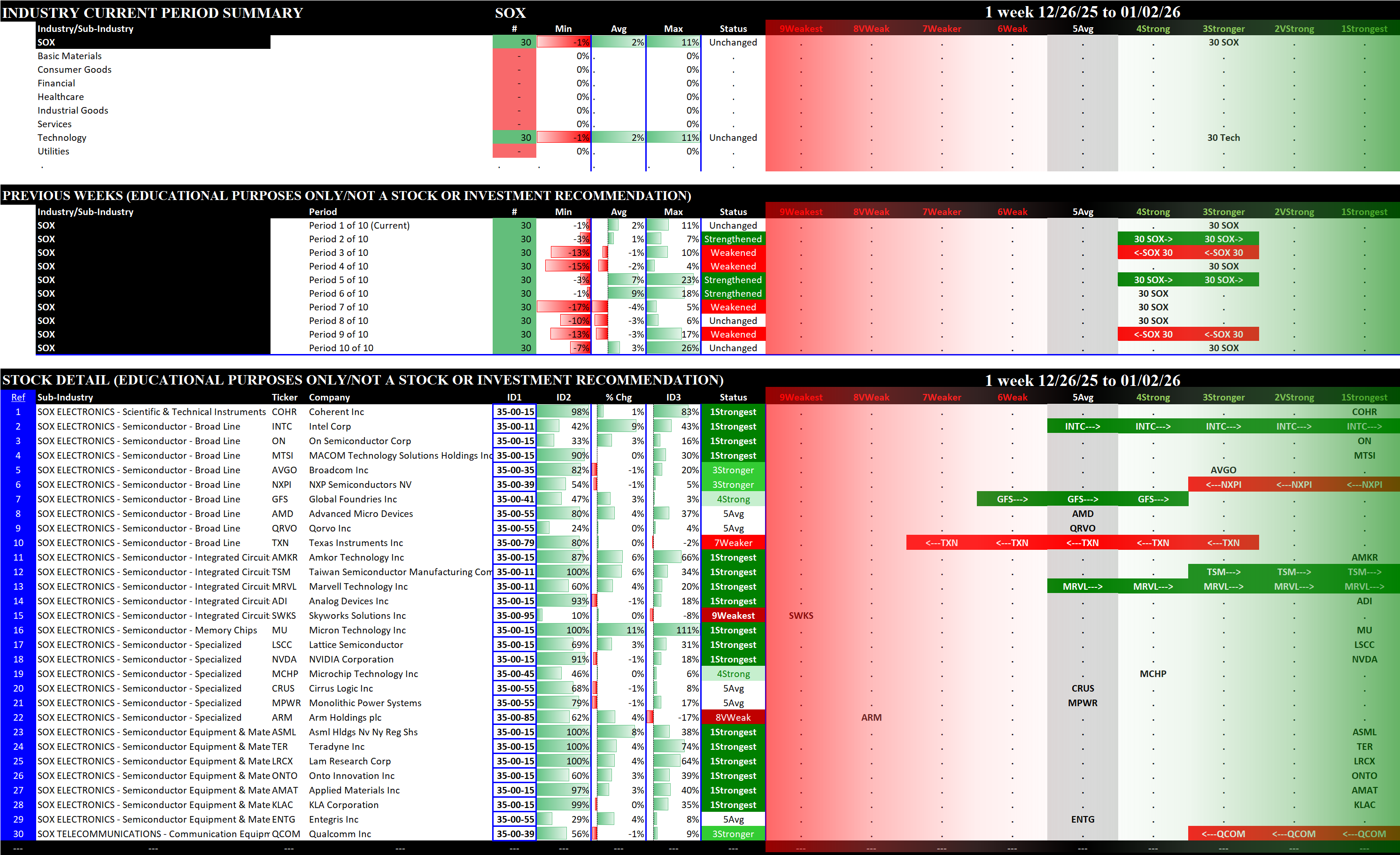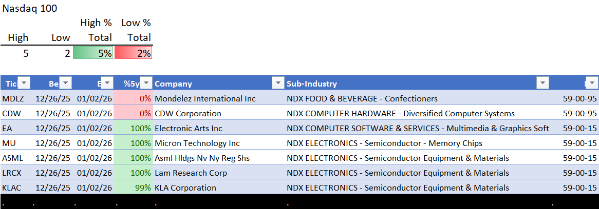 Indexes Fri 2026-01-02: Unchanged SOX (3Stronger); Weakened/0 NDX (5Average); Weakened/-1 MAG7 (4Strong), SP500 (5Average)