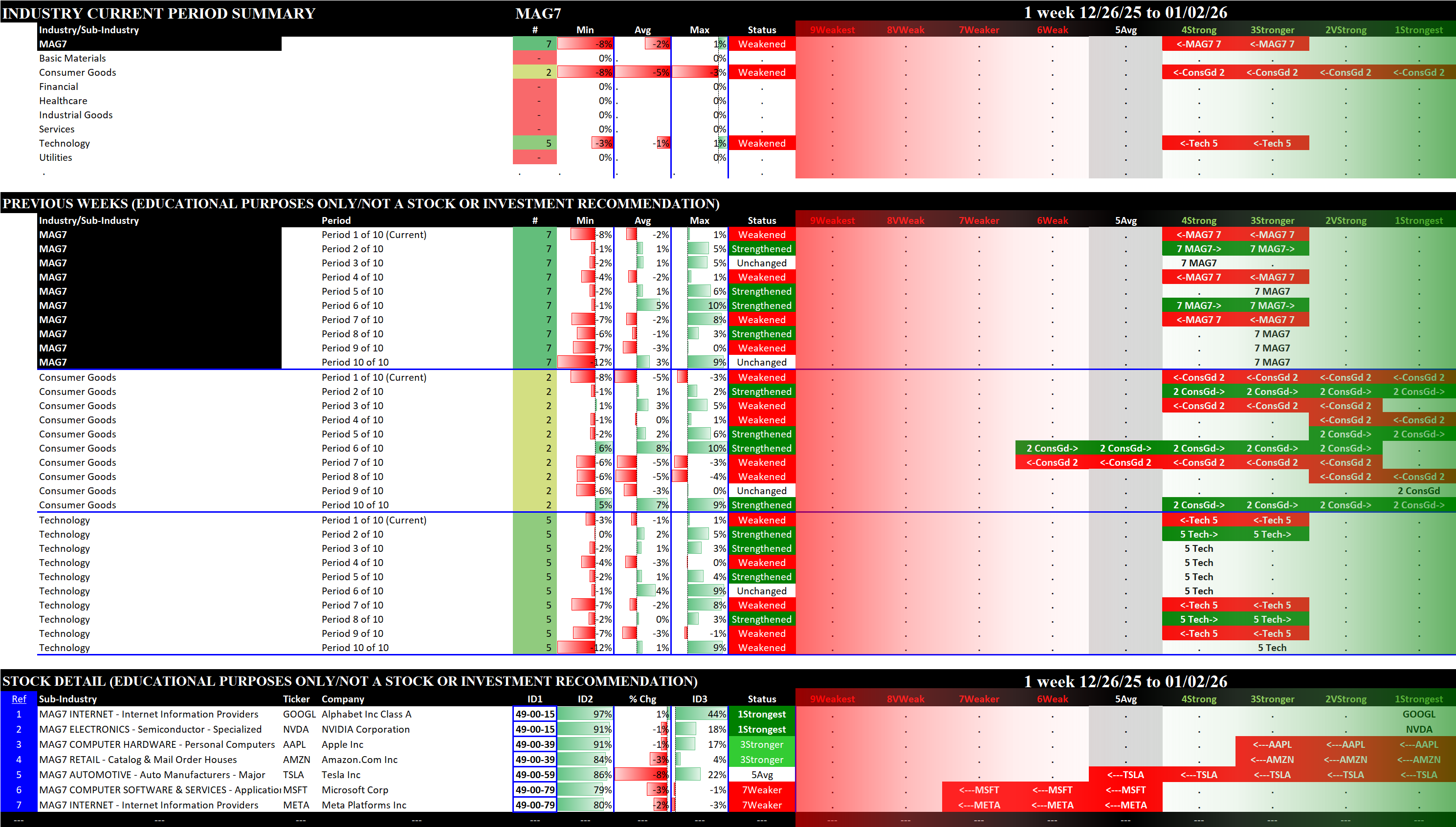 This post shows strengthening/weakening detail for this week for the S&P 500, Nasdaq 100, the Philadelphia Semiconductor Index (SOX), and the so-called Magnificent 7 stocks (MAG7).