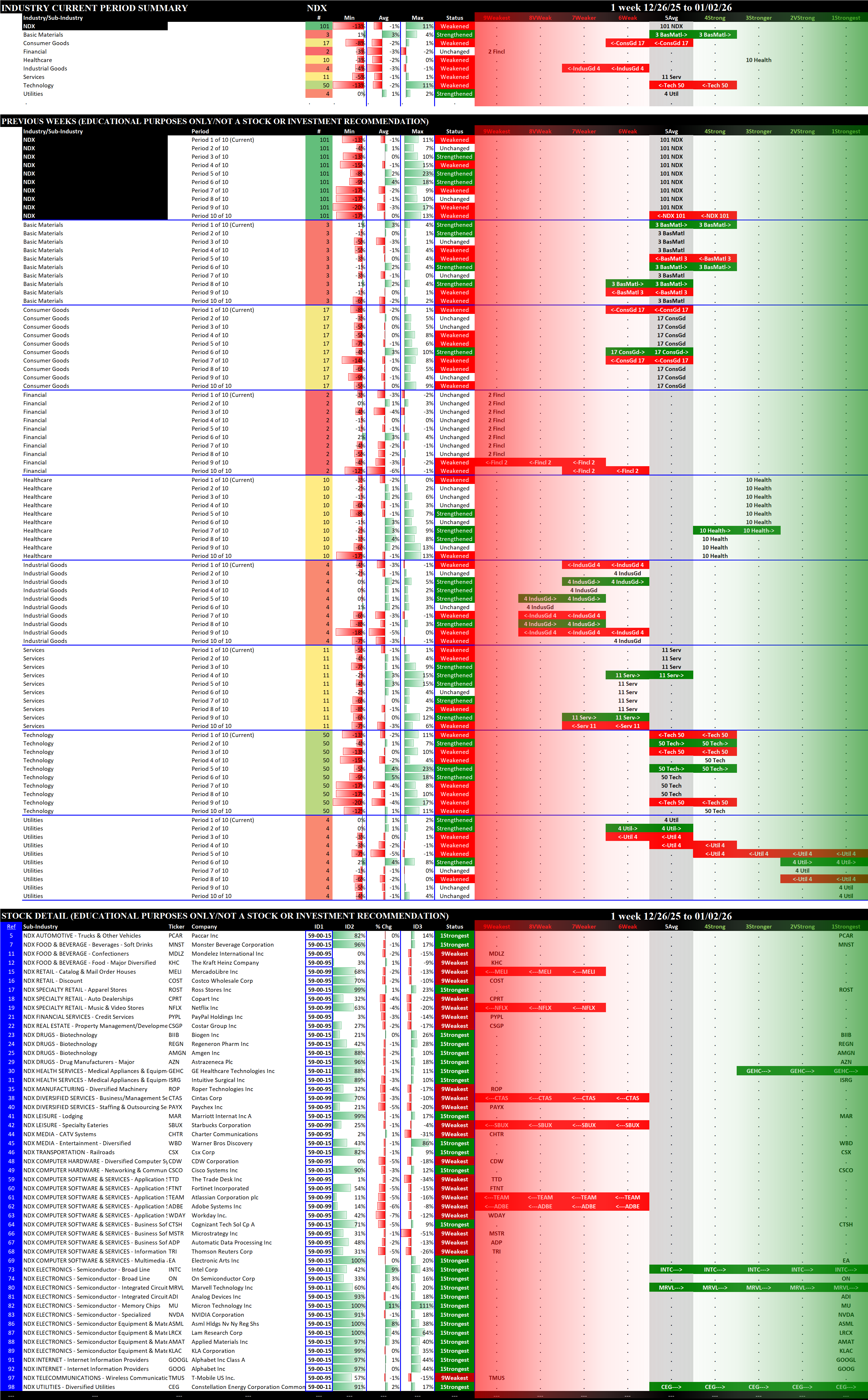 The stock detail below for the S&P 500 and the Nasdaq 100 shows only the 1Strongest and 9Weakest stocks, grouped by Sector then Industry then Sub-industry. The SOX and MAG7 detail shows all stocks in each.