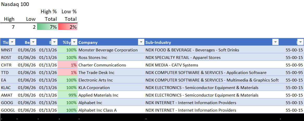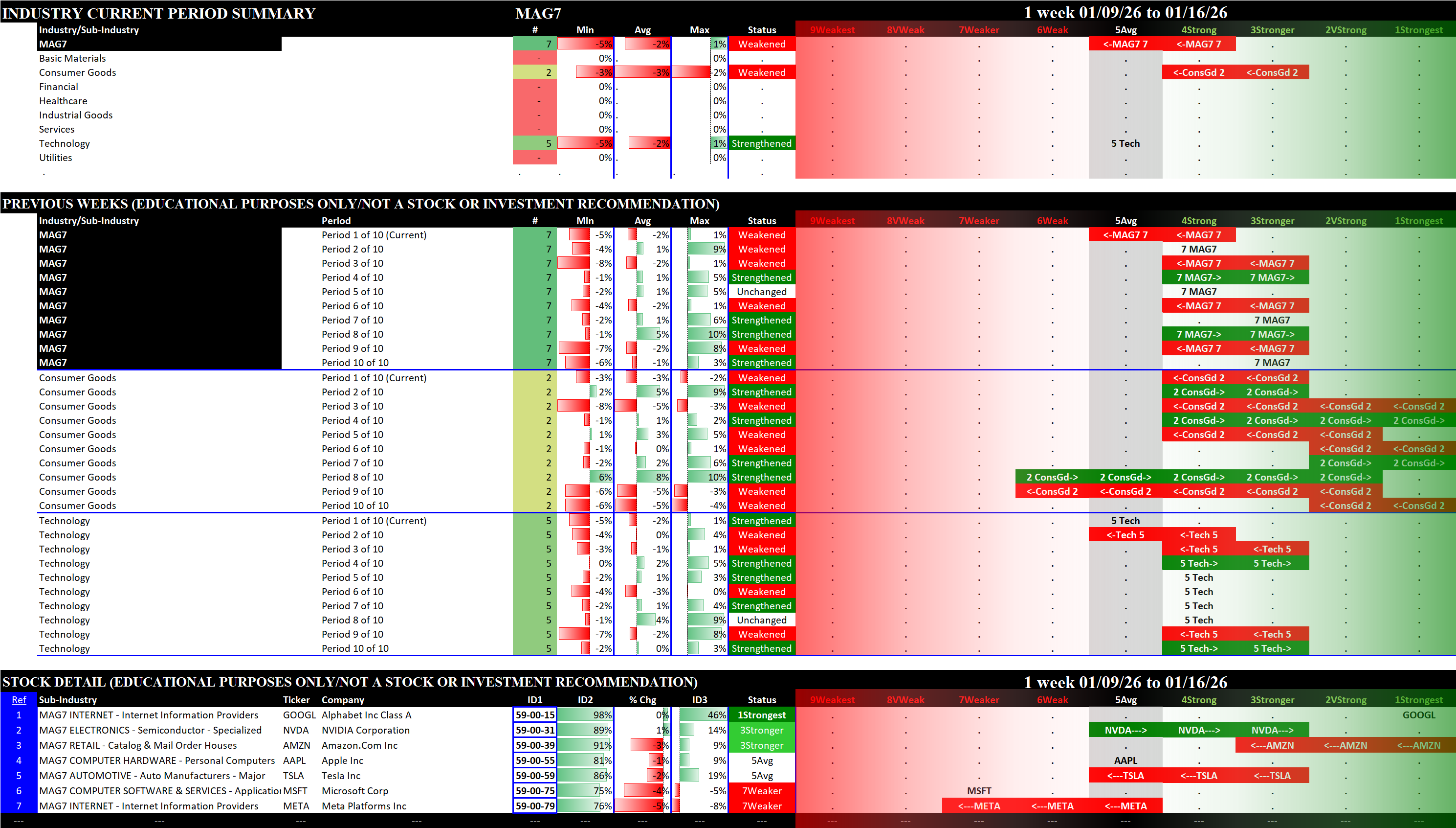 This post shows strengthening/weakening detail for this week for the S&P 500, Nasdaq 100, the Philadelphia Semiconductor Index (SOX), and the so-called Magnificent 7 stocks (MAG7).