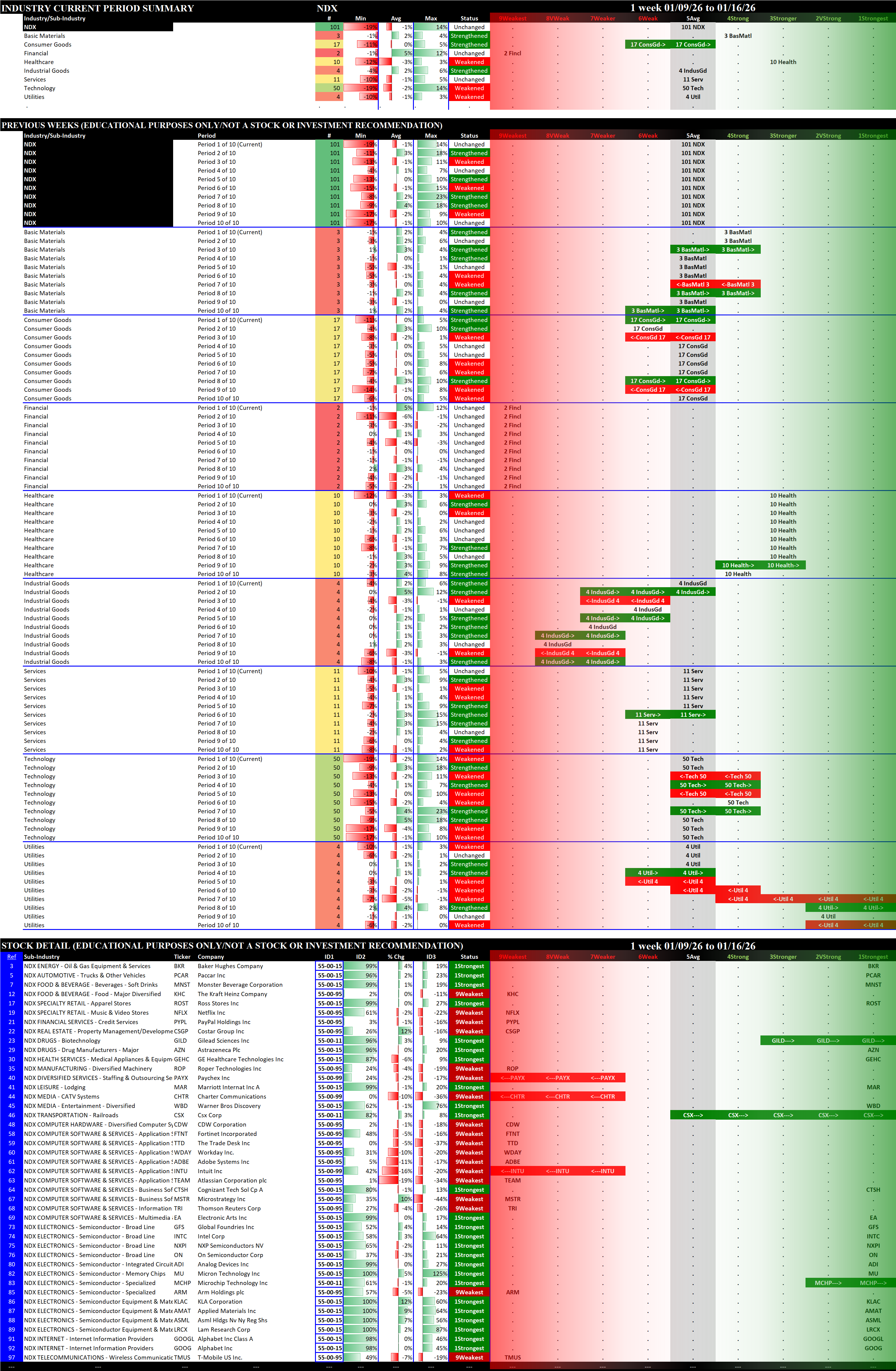 The stock detail below for the S&P 500 and the Nasdaq 100 shows only the 1Strongest and 9Weakest stocks, grouped by Sector then Industry then Sub-industry. The SOX and MAG7 detail shows all stocks in each.
