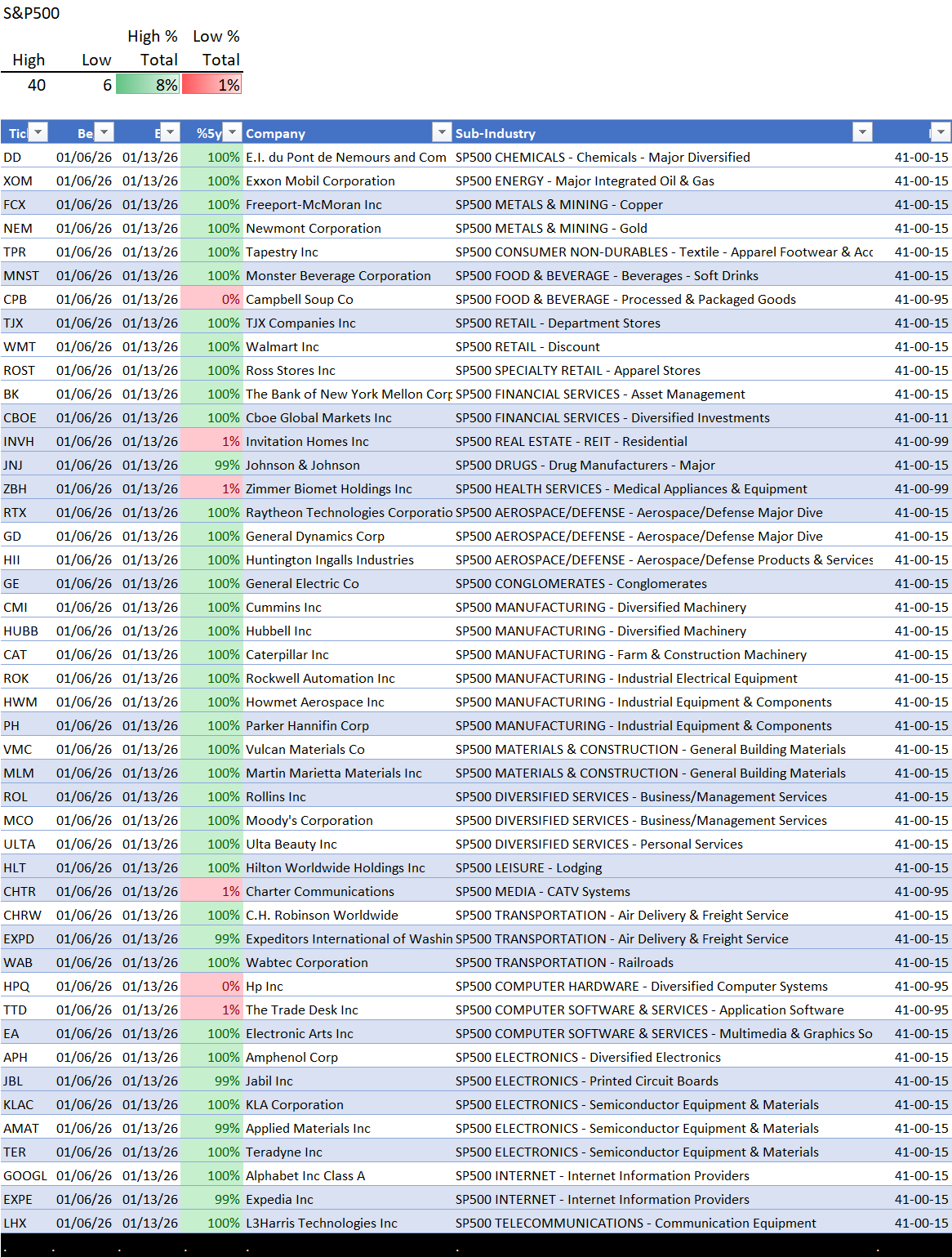 Grouped by sector then industry then sub-industry.