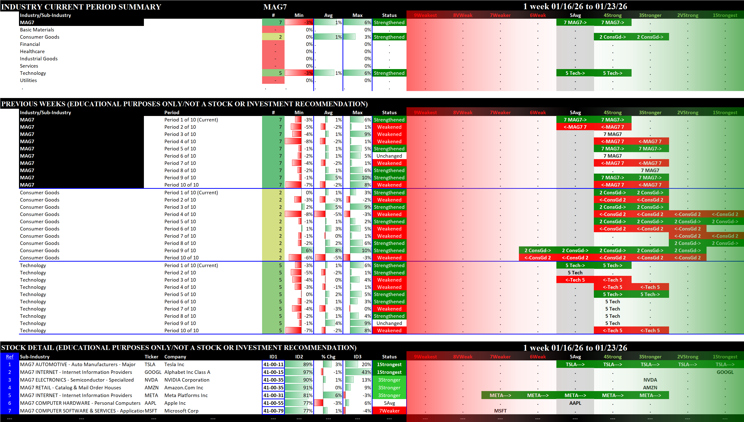 This post shows strengthening/weakening detail for this week for the S&P 500, Nasdaq 100, the Philadelphia Semiconductor Index (SOX), and the so-called Magnificent 7 stocks (MAG7).