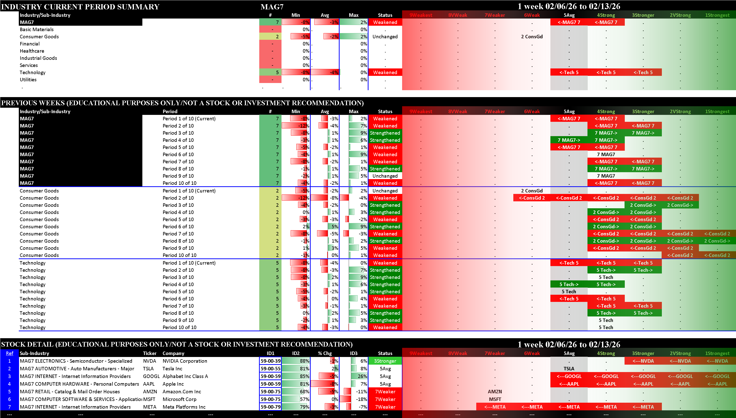 This post shows strengthening/weakening detail for this week for the S&P 500, Nasdaq 100, the Philadelphia Semiconductor Index (SOX), and the so-called Magnificent 7 stocks (MAG7).