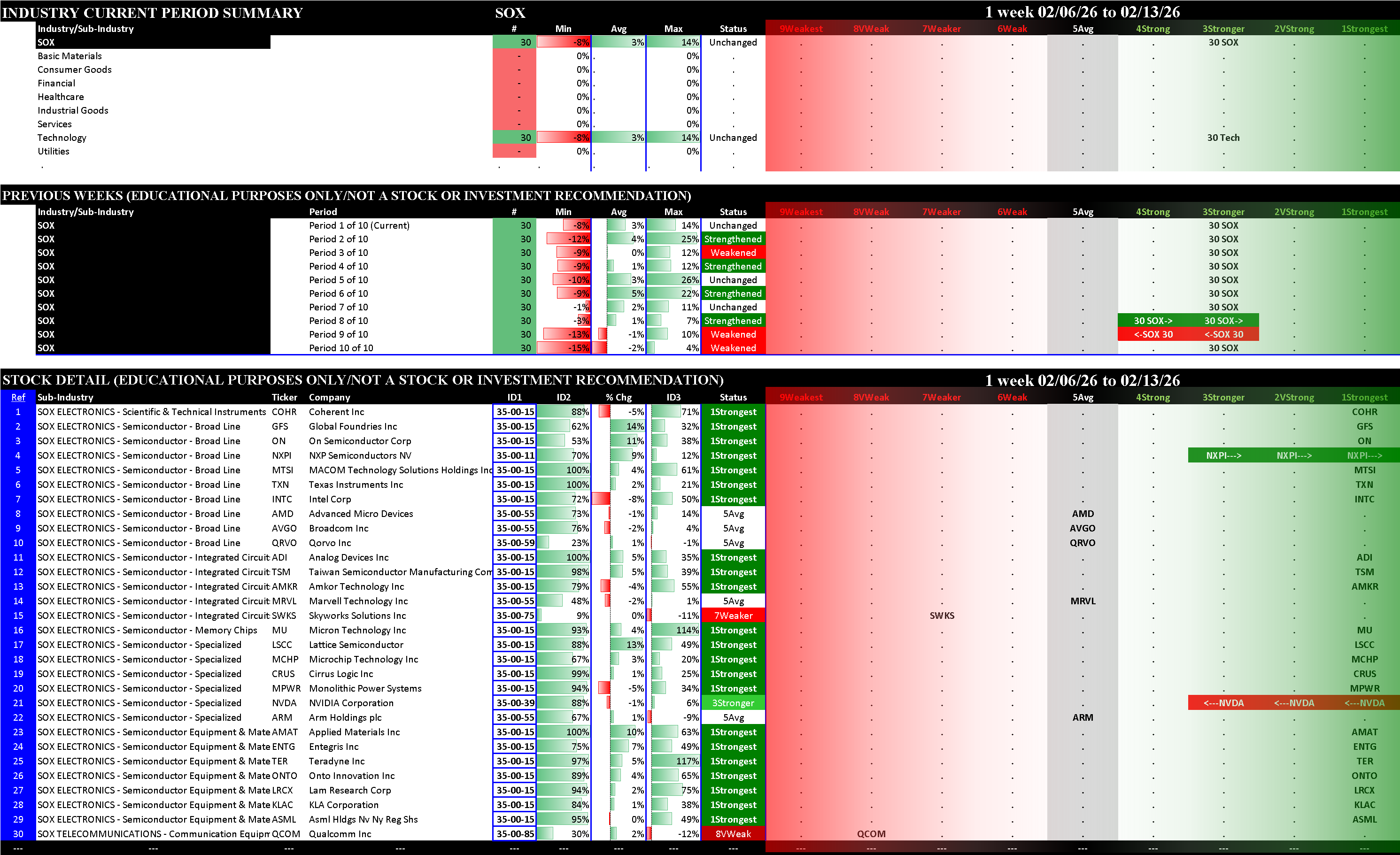 Indexes Fri 2026-02-13: Unchanged SOX (3Stronger); Weakened/0 SP500 (4Strong), NDX (5Average); Weakened/-1 MAG7 (5Average)
