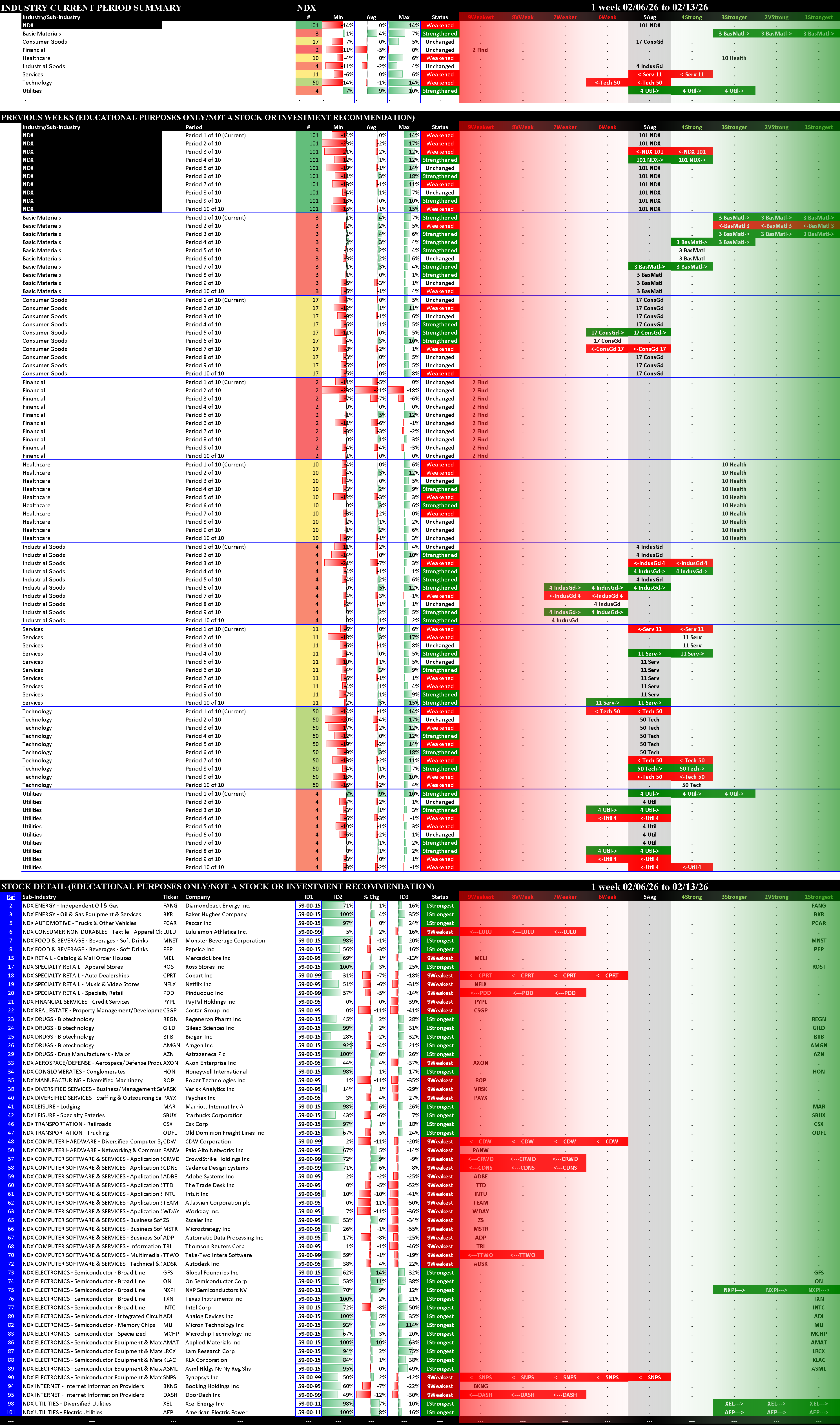 The stock detail below for the S&P 500 and the Nasdaq 100 shows only the 1Strongest and 9Weakest stocks, grouped by Sector then Industry then Sub-industry. The SOX and MAG7 detail shows all stocks in each.
