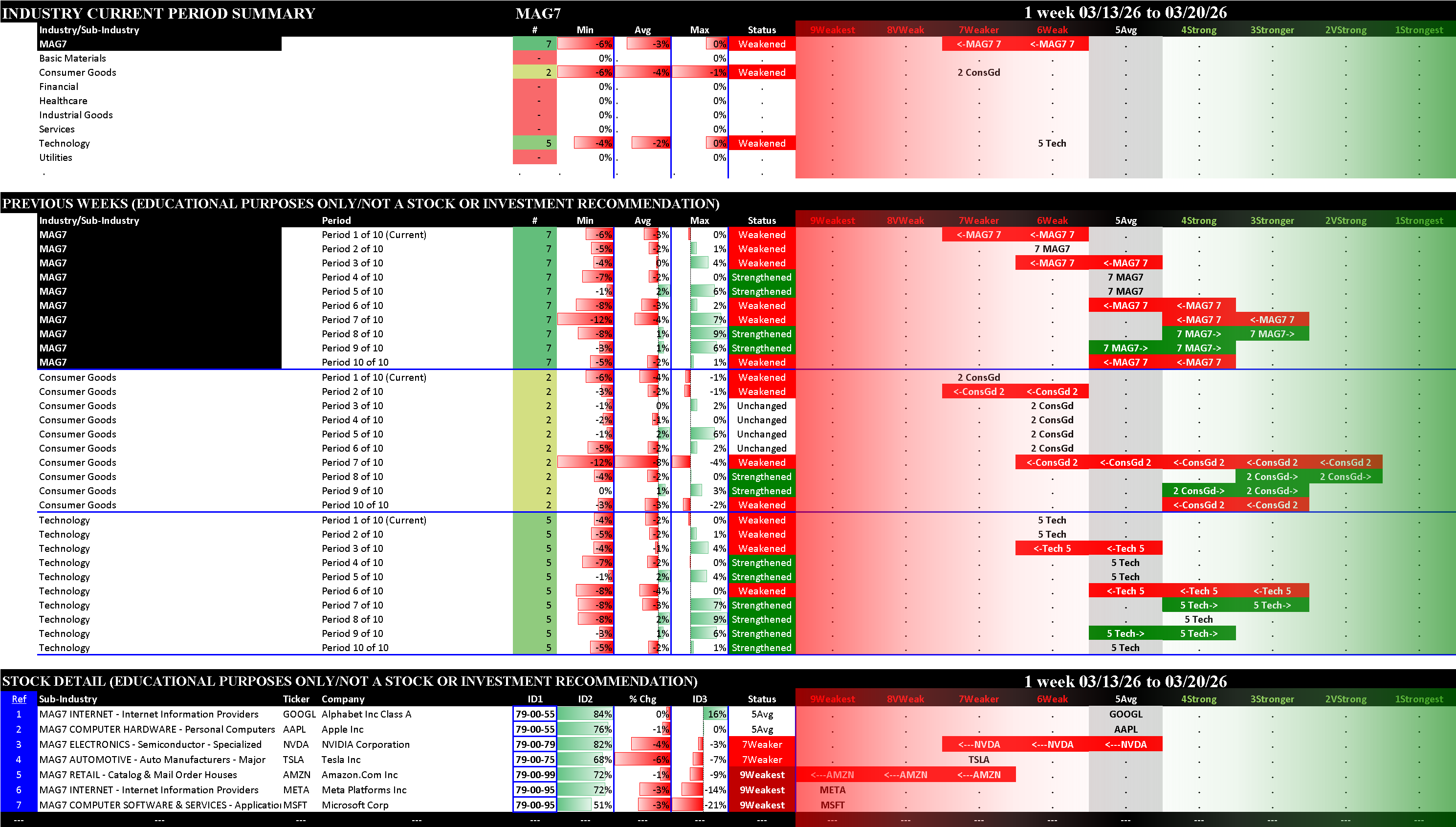 This post shows strengthening/weakening detail for this week for the S&P 500, Nasdaq 100, the Philadelphia Semiconductor Index (SOX), and the so-called Magnificent 7 stocks (MAG7).