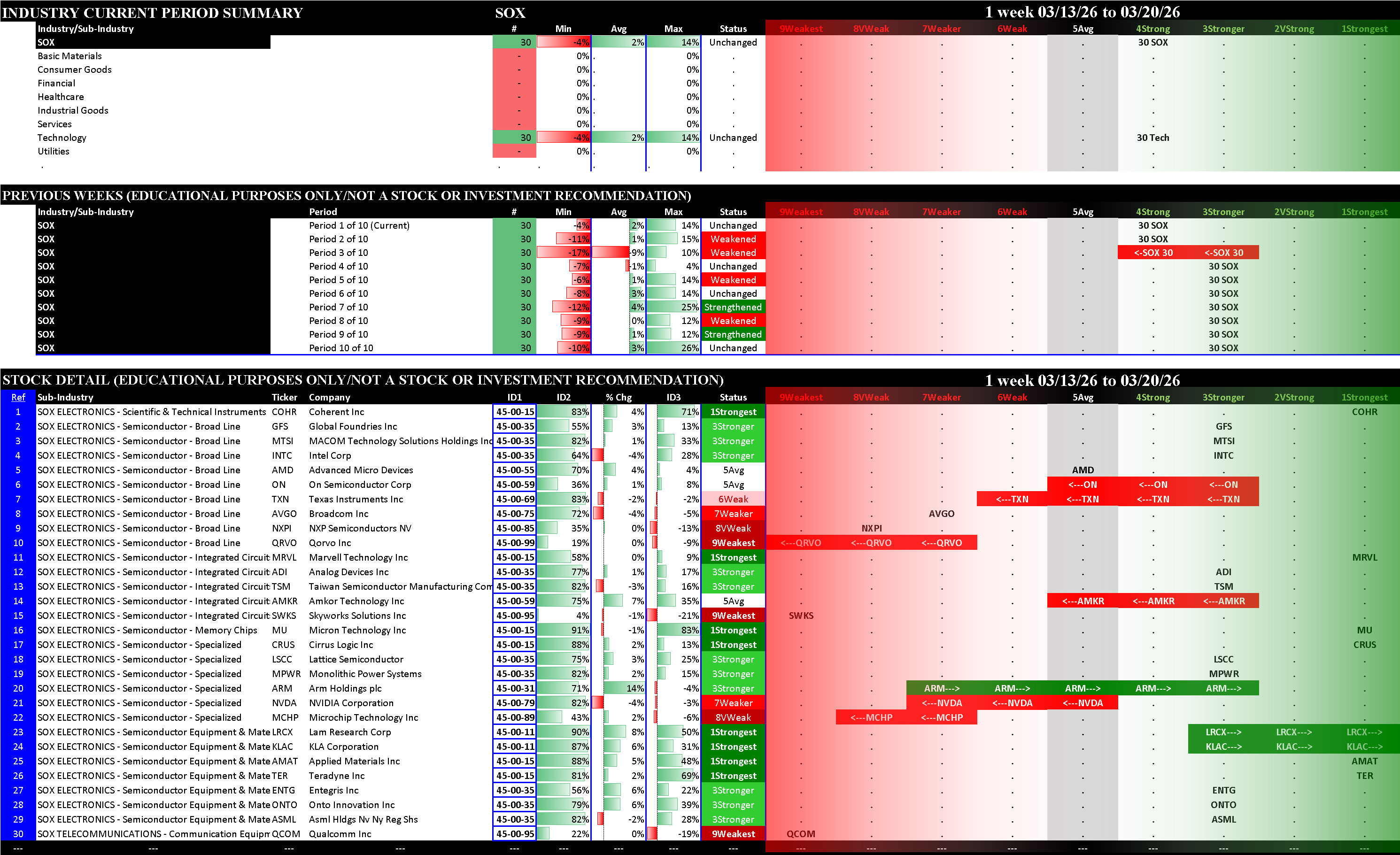 The stock detail below for the S&P 500 and the Nasdaq 100 shows only the 1Strongest and 9Weakest stocks, grouped by Sector then Industry then Sub-industry. The SOX and MAG7 detail shows all stocks in each.