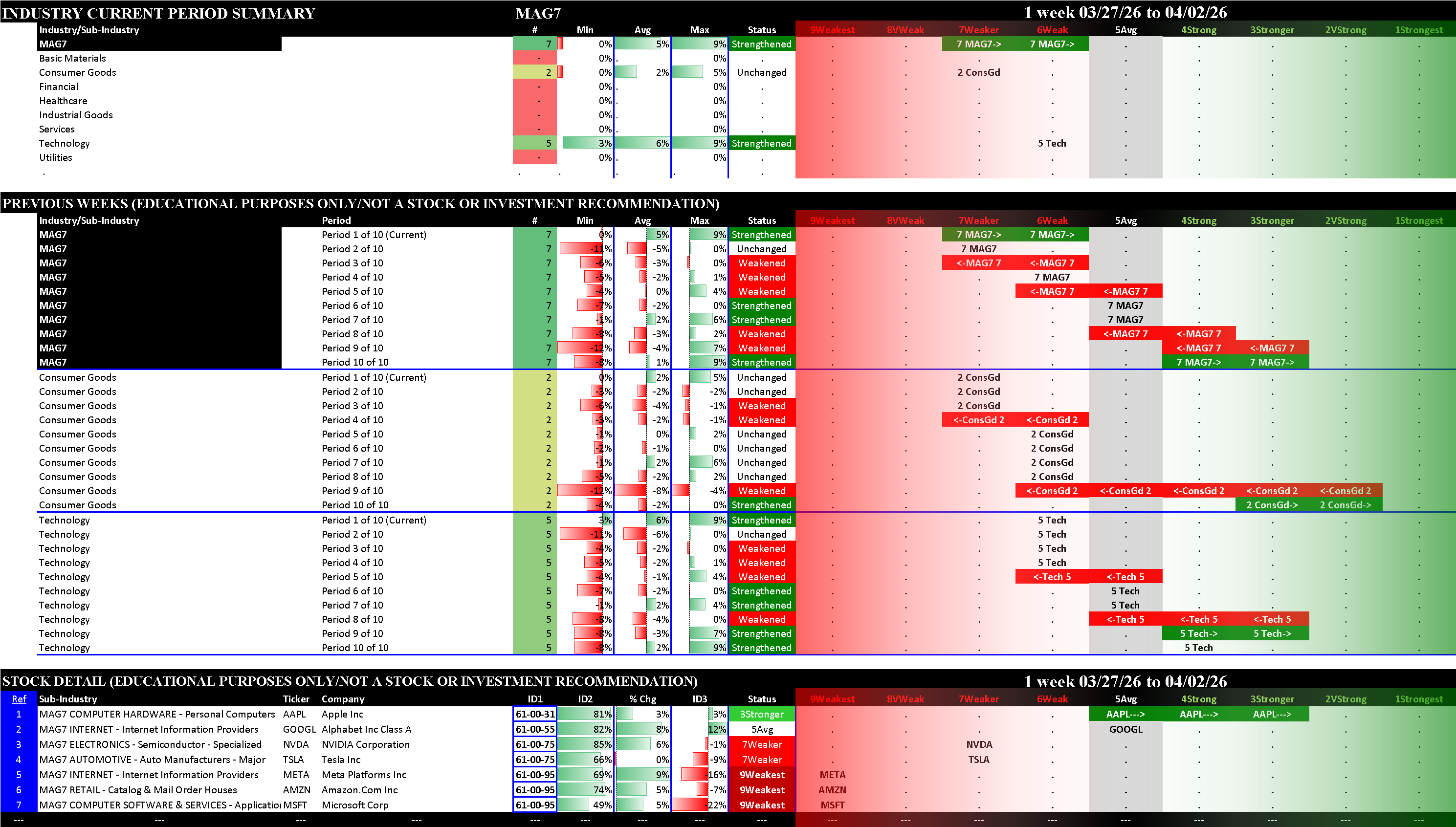 This post shows strengthening/weakening detail for this week for the S&P 500, Nasdaq 100, the Philadelphia Semiconductor Index (SOX), and the so-called Magnificent 7 stocks (MAG7).