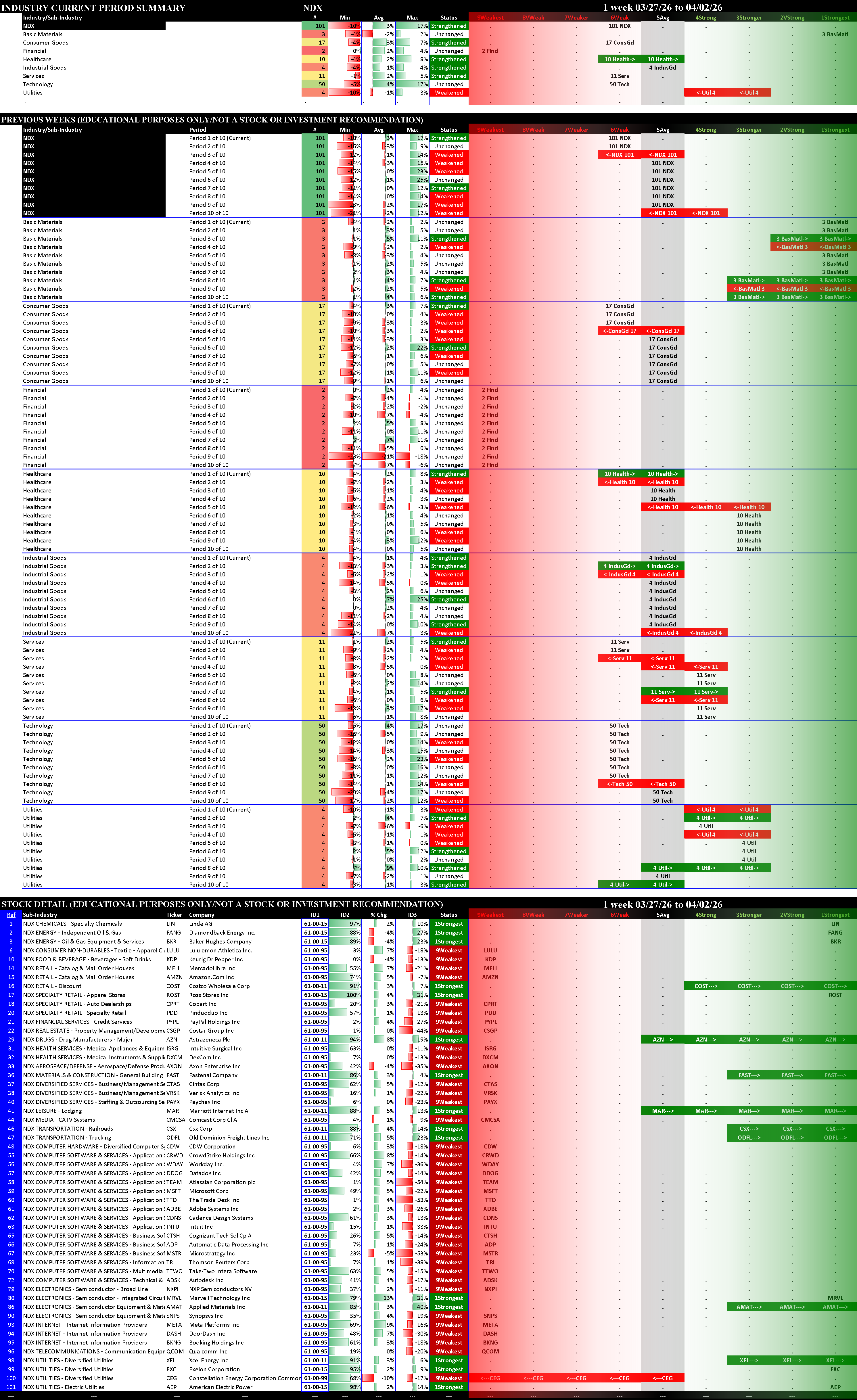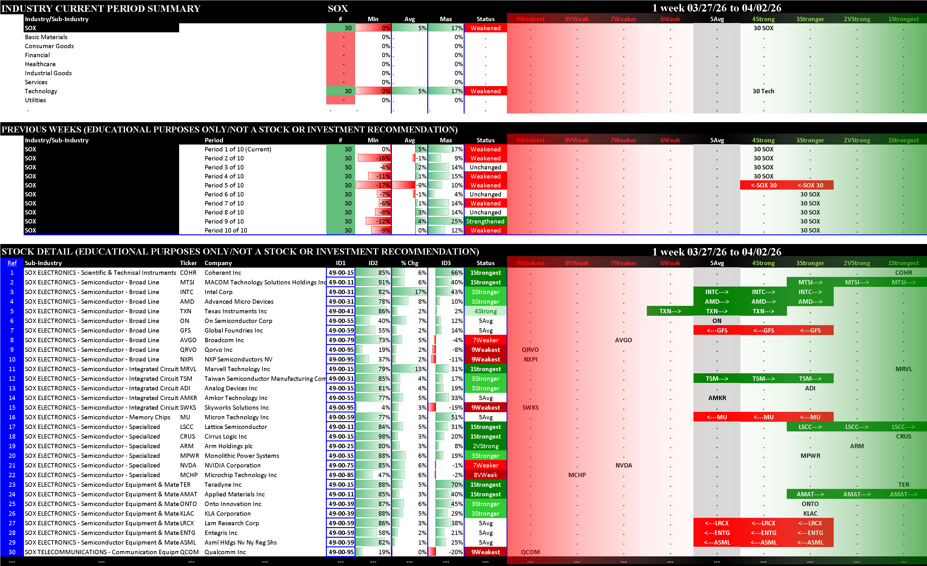 Indexes Thu 2026-04-02: Strengthened/+1 SP500 (5Average), MAG7 (6Weak); Strengthened/0 NDX (6Weak); Weakened/0 SOX (4Strong)