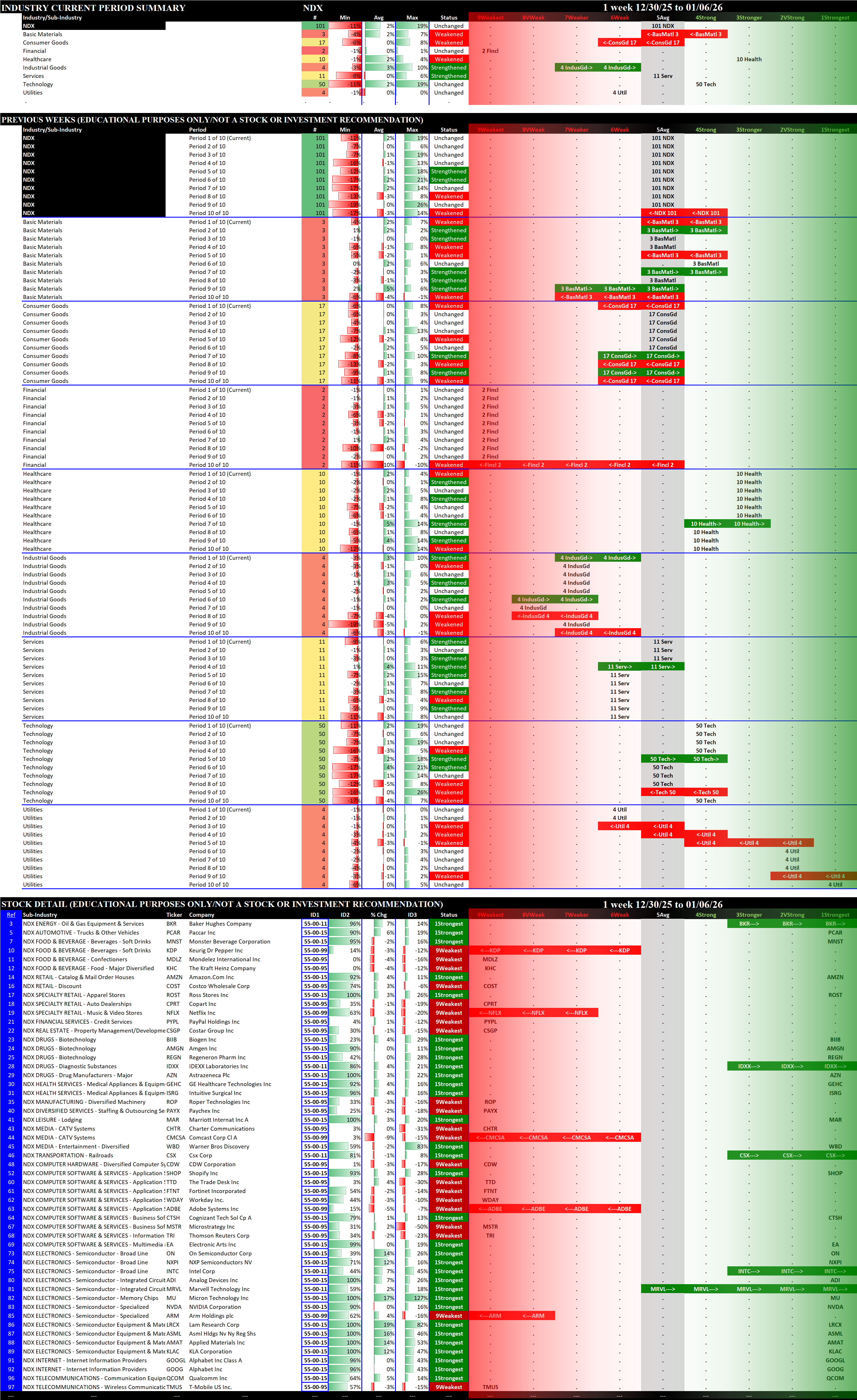 The stock detail below for the S&P 500 and the Nasdaq 100 shows only the 1Strongest and 9Weakest stocks, grouped by Sector then Industry then Sub-industry. The SOX and MAG7 detail shows all stocks in each.