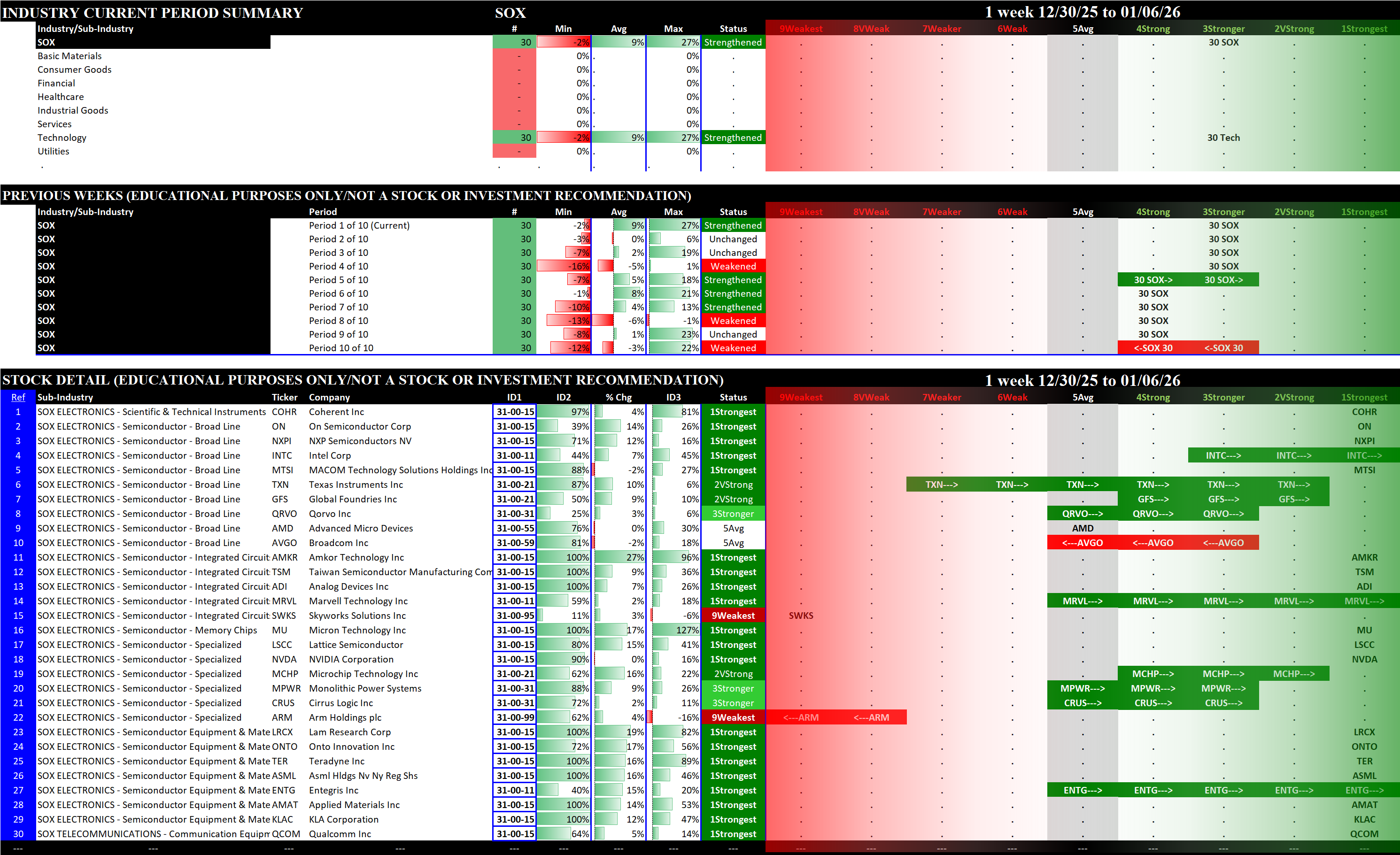 Indexes Tue 2026-01-06: Strengthened/0 SOX (3Stronger); Unchanged SP500, NDX (5Average); Weakened/-1 MAG7 (4Strong)