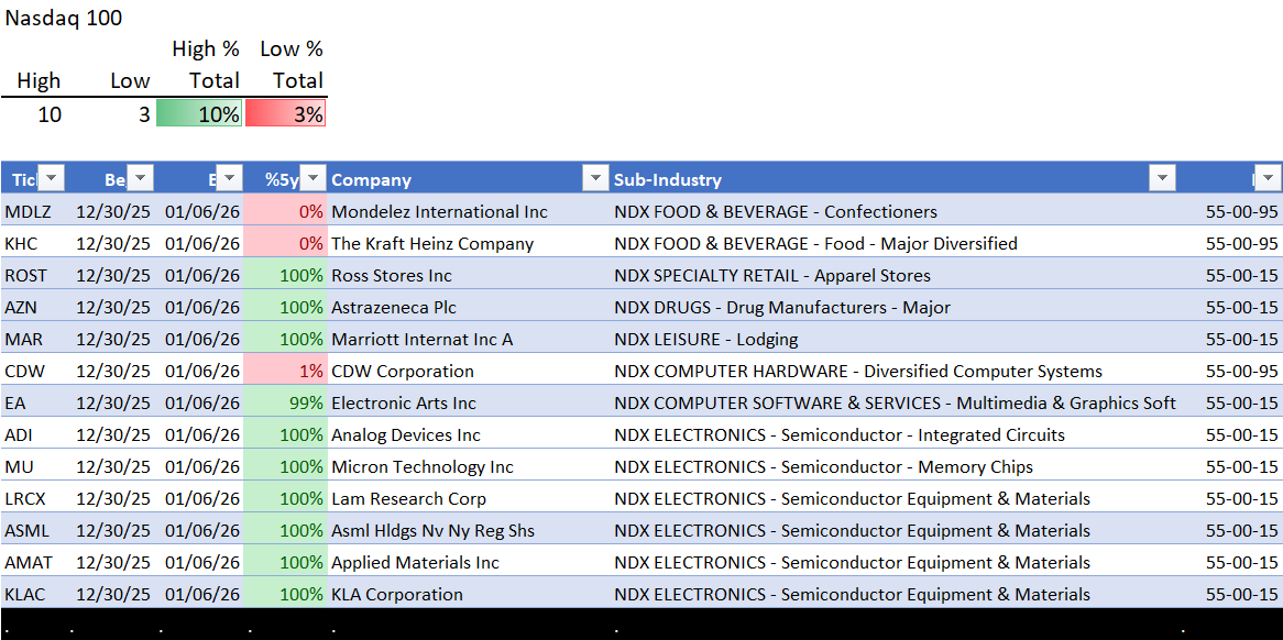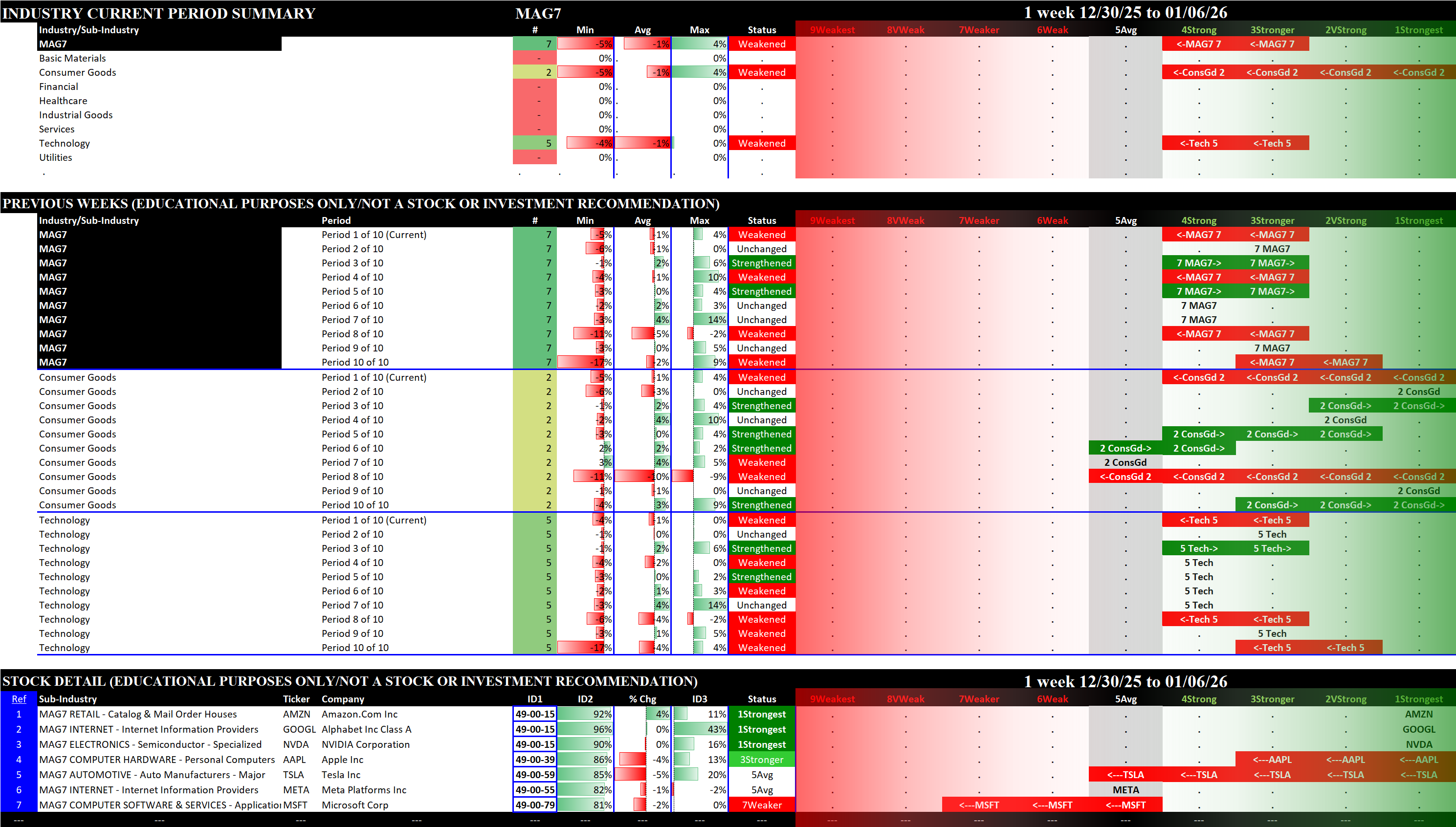 This post shows strengthening/weakening detail for this week for the S&P 500, Nasdaq 100, the Philadelphia Semiconductor Index (SOX), and the so-called Magnificent 7 stocks (MAG7).