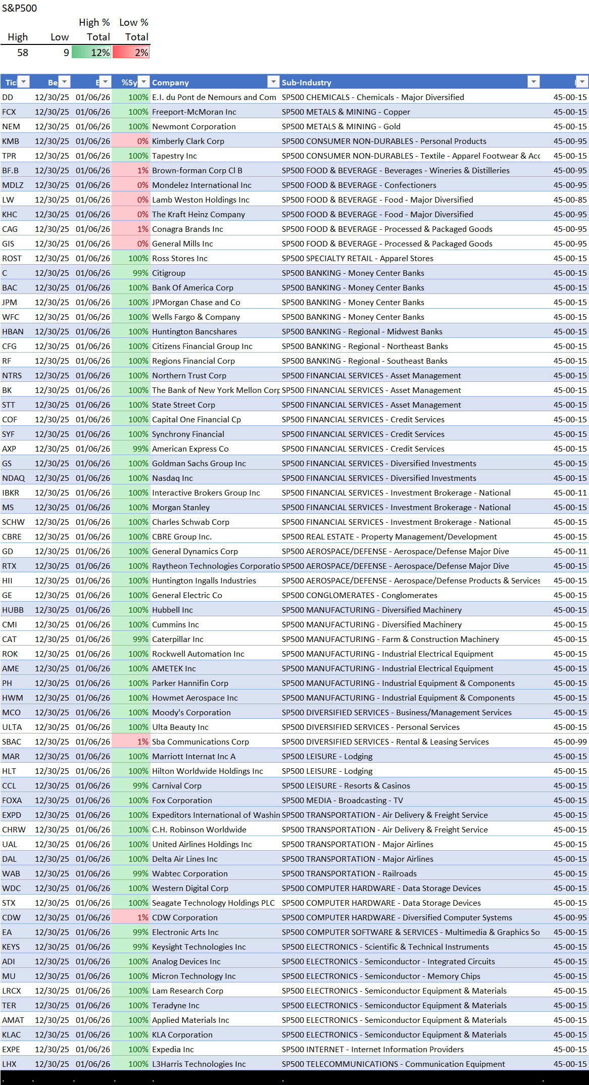 Grouped by sector then industry then sub-industry.