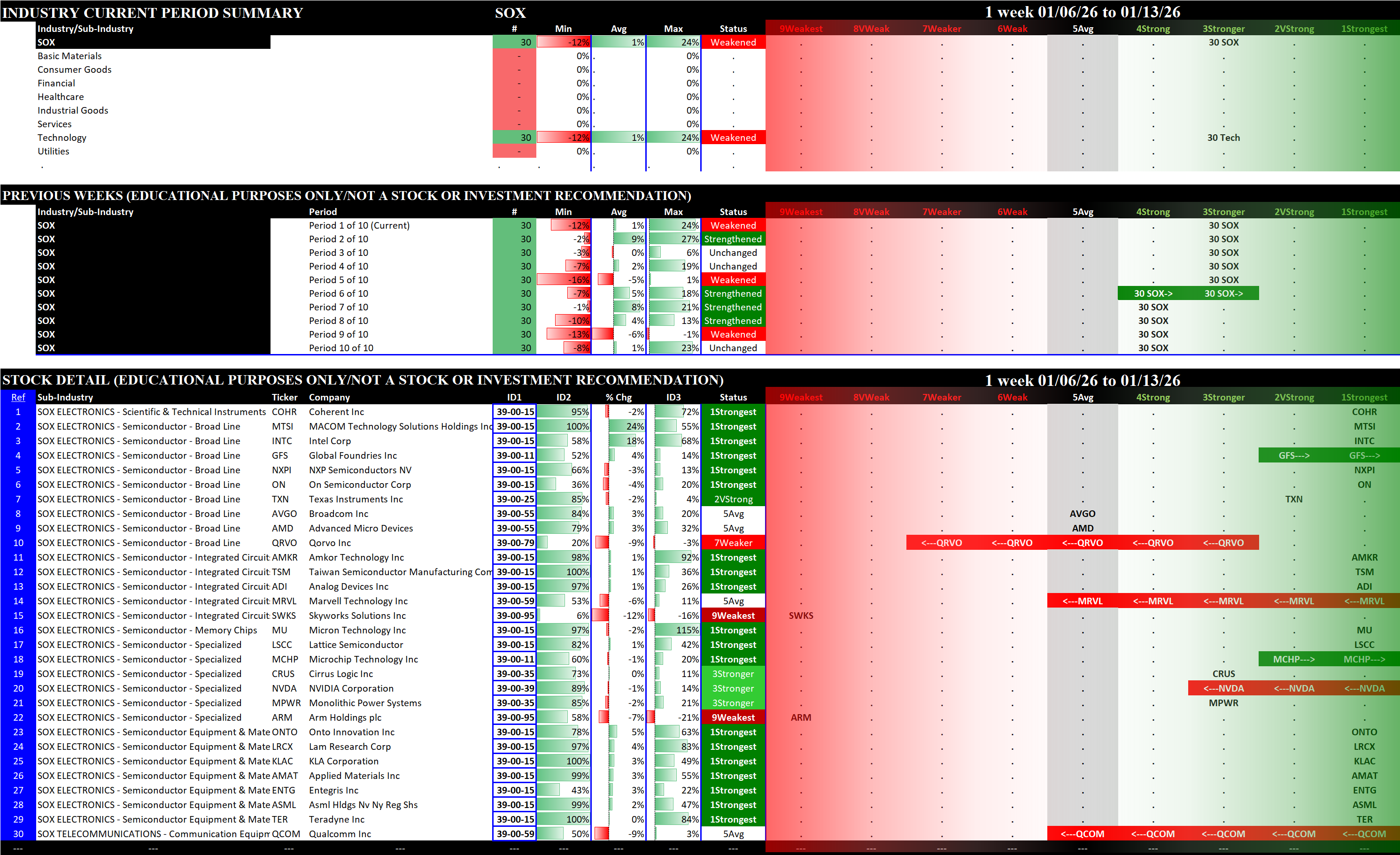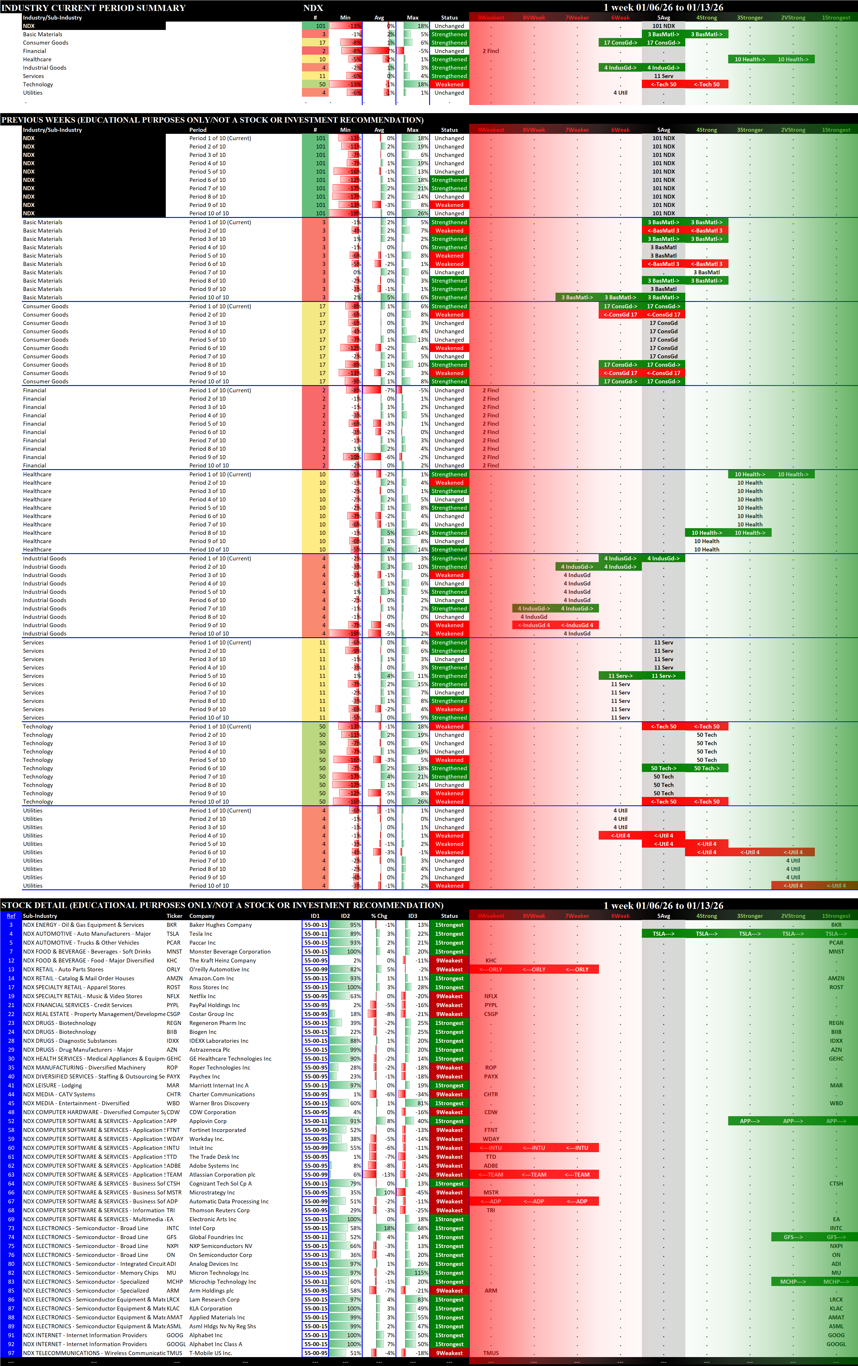 Indexes Tue 2026-01-13: Strengthened/0 SP500 (4Strong); Unchanged NDX (5Average); Weakened/0 SOX (3Stronger), MAG7 (4Strong)