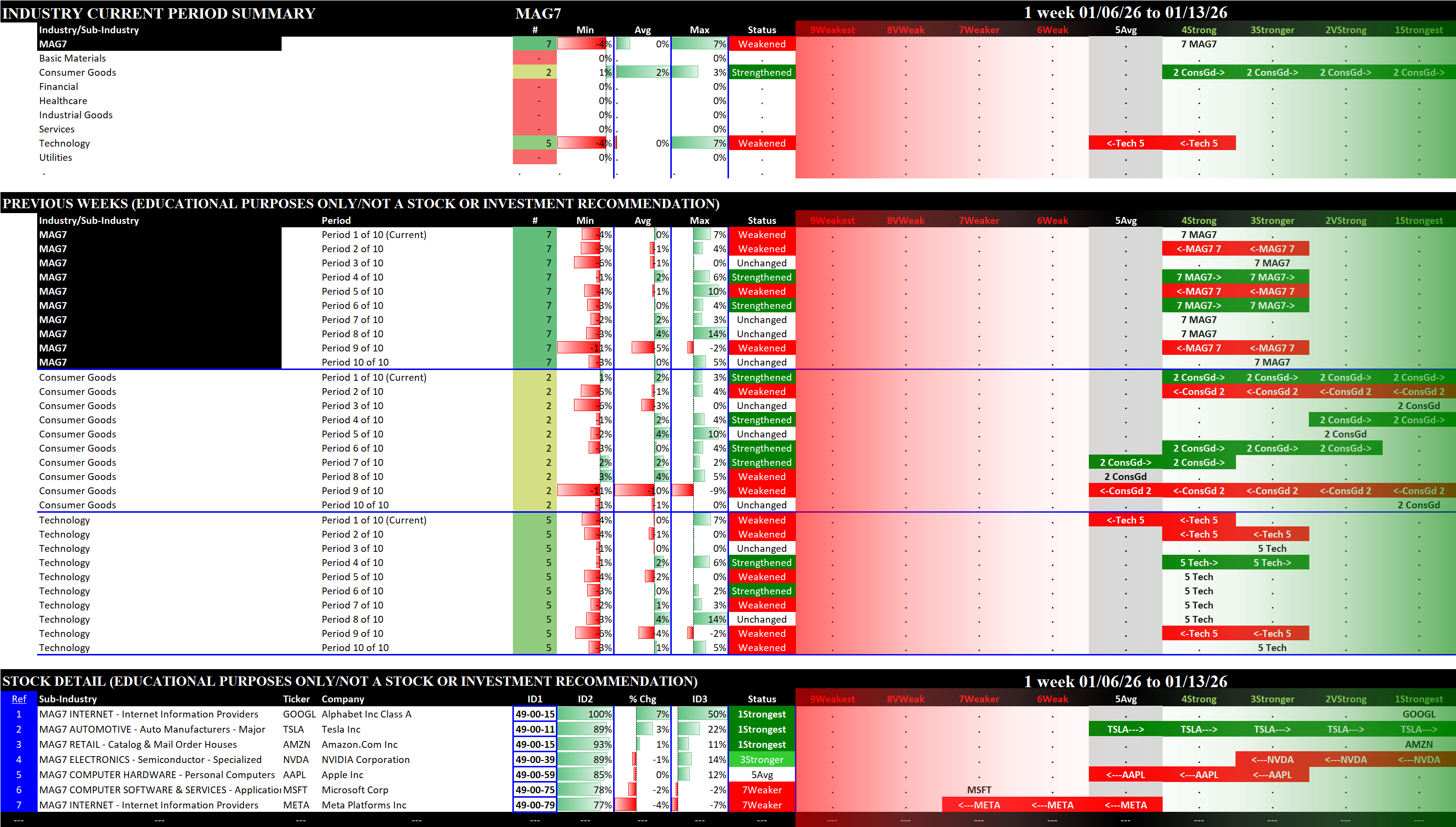 This post shows strengthening/weakening detail for this week for the S&P 500, Nasdaq 100, the Philadelphia Semiconductor Index (SOX), and the so-called Magnificent 7 stocks (MAG7).